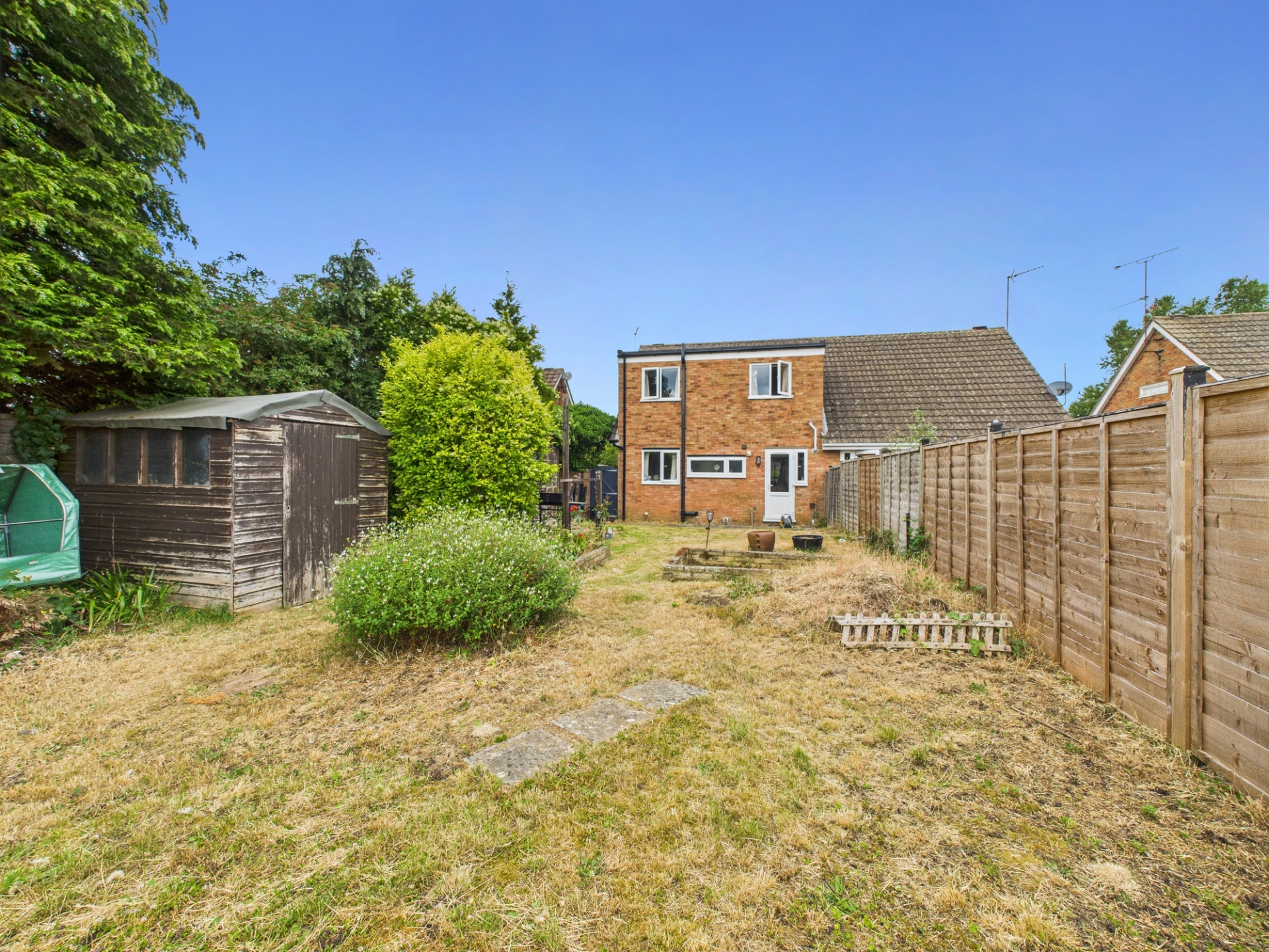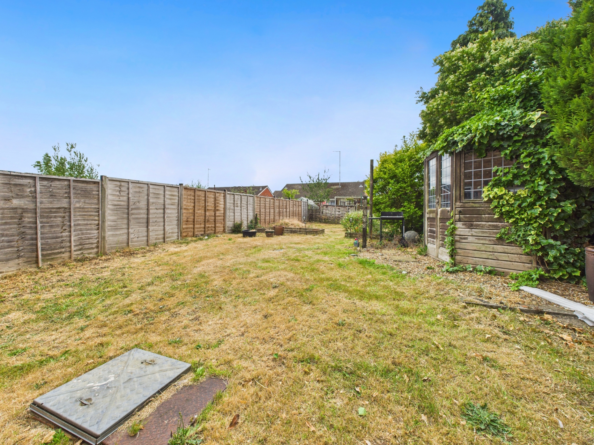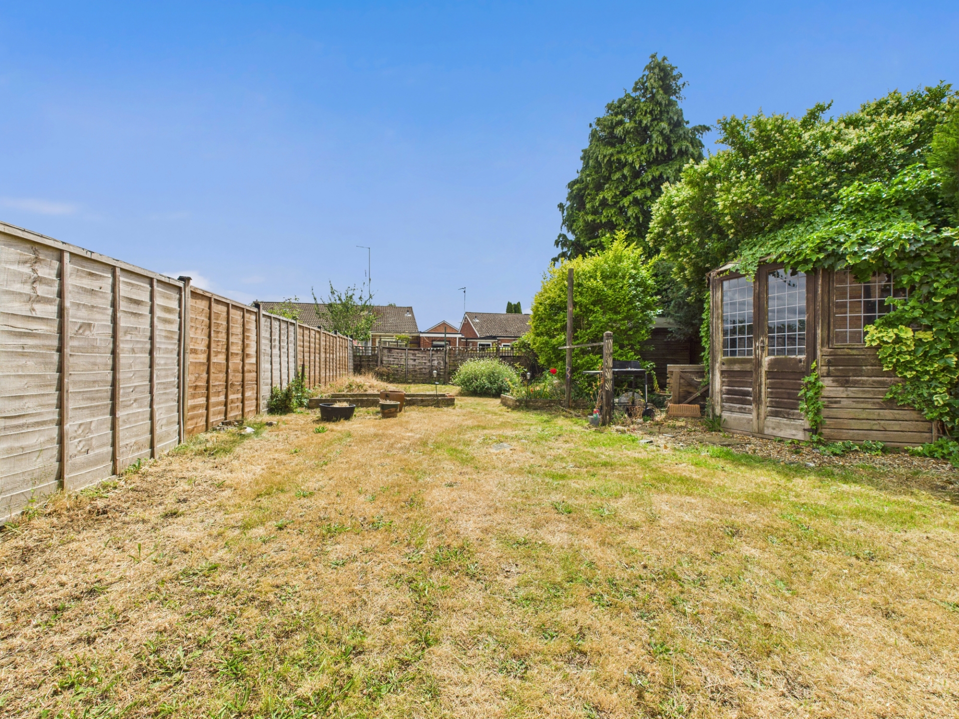 Rear garden, mainly laid to lawn enclosed by timber fencing.