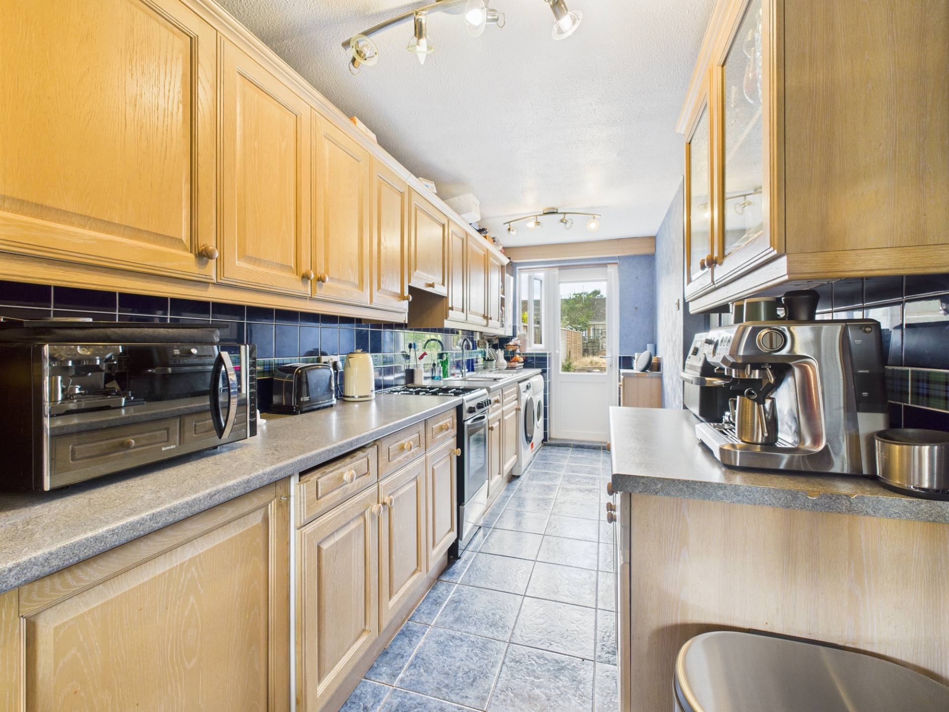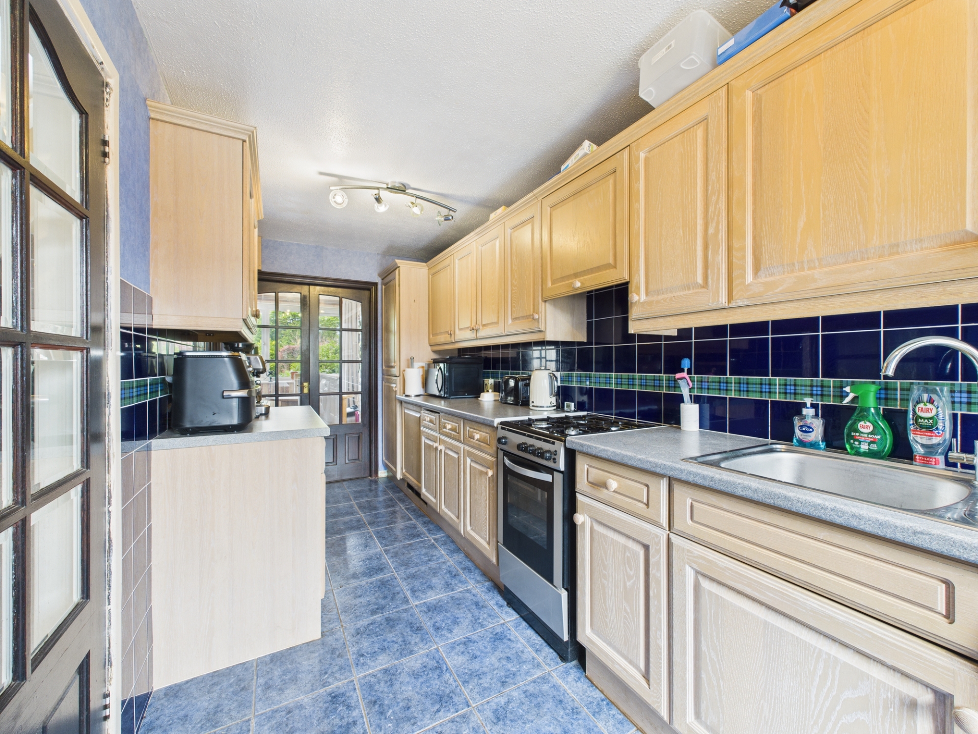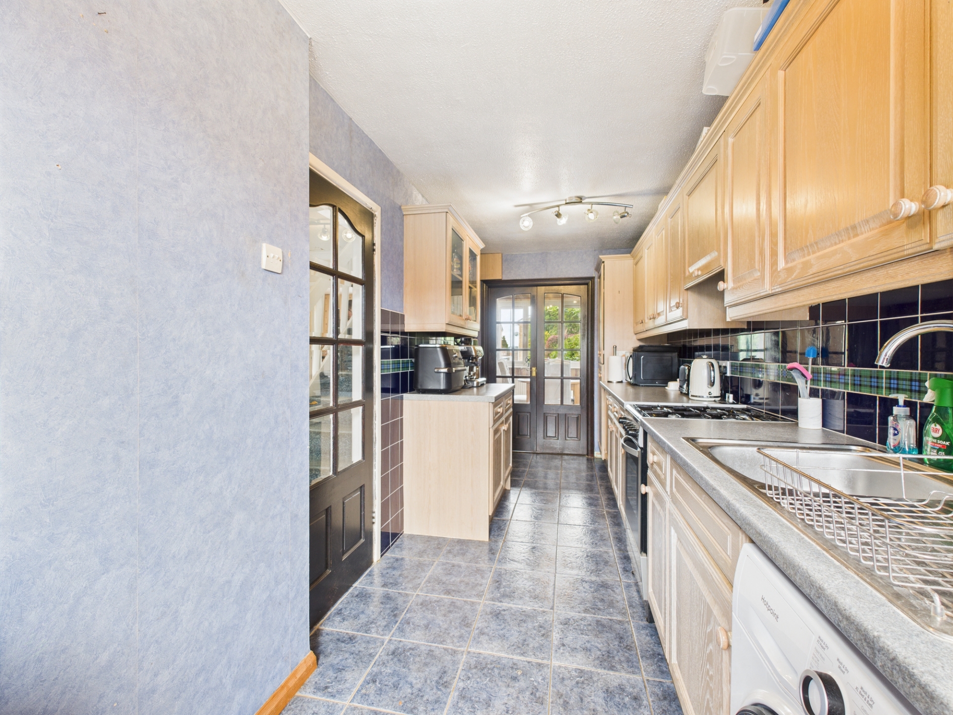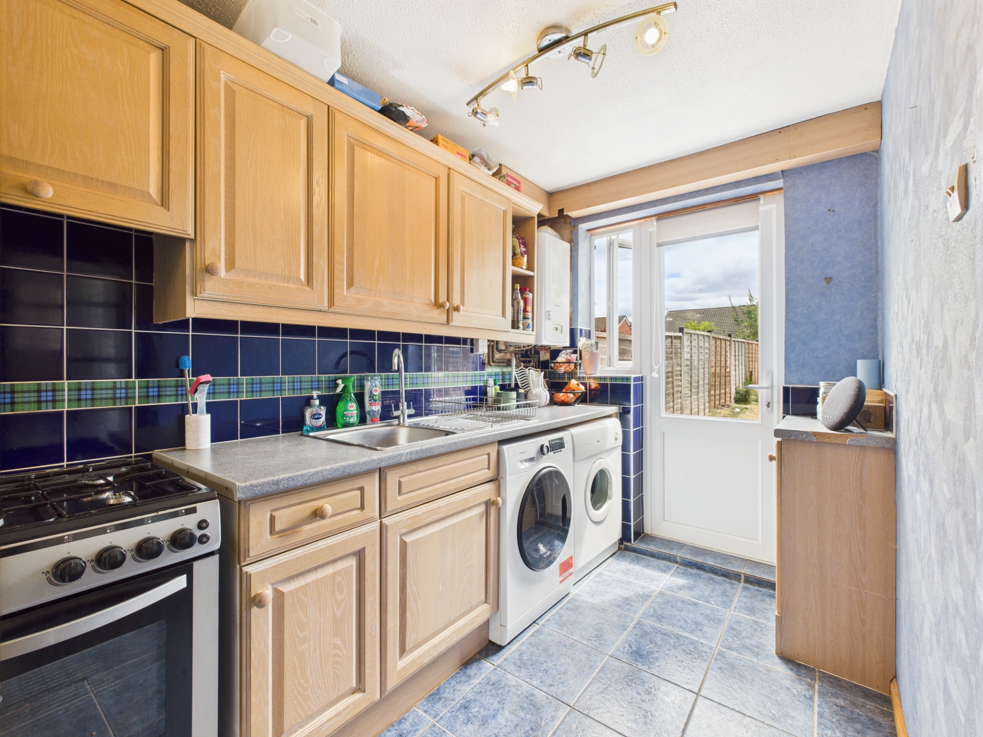 Door to rear opening on to the rear garden. Tiled flooring. A range of wall and base storage units. Roll top work surfaces. Stainless steel sink with mixer tap and drainer.