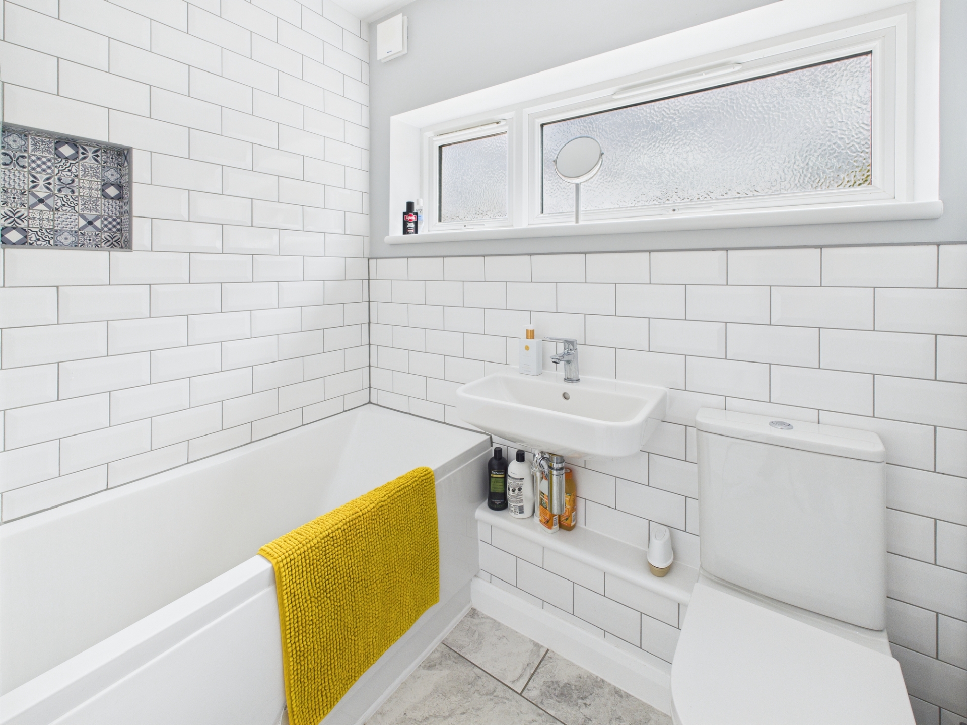 Obscured double glazed window to rear elevation. Tiled flooring and partially tiled walls. Three piece suite comprising wash hand basin, low level WC and bath with shower unit fitted over. Heated towel rail.