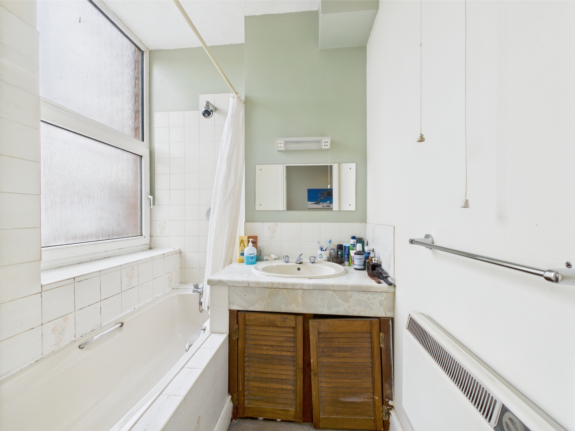 uPVC frosted window. Electric radiator. Two piece suite comprising panelled bath with shower over and vanity wash hand basin. Shaver socket.
