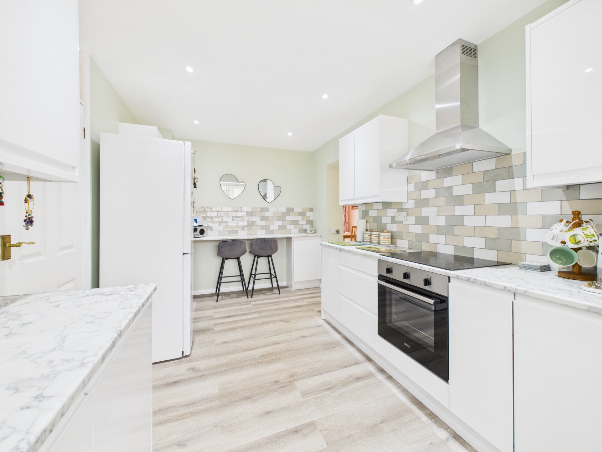 Double glazed window to front elevation. Refitted wall mounted and base units in white with worktops over. Stainless steel sink unit with mixer tap and tiled splashback. Built in electric hob, oven and extractor hood. Metro style tiling. Space for upright fridge freezer. Breakfast bar.