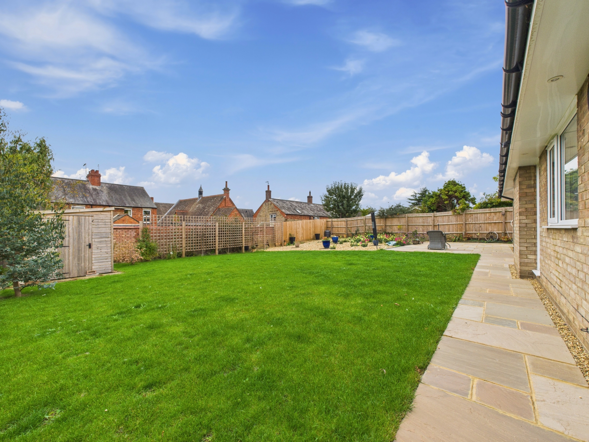 Laid to lawn. Flower borders and beds. Hard standing for shed. Enclosed with fencing and side gated for access. continuation of Indian sandstone paving for patio area.