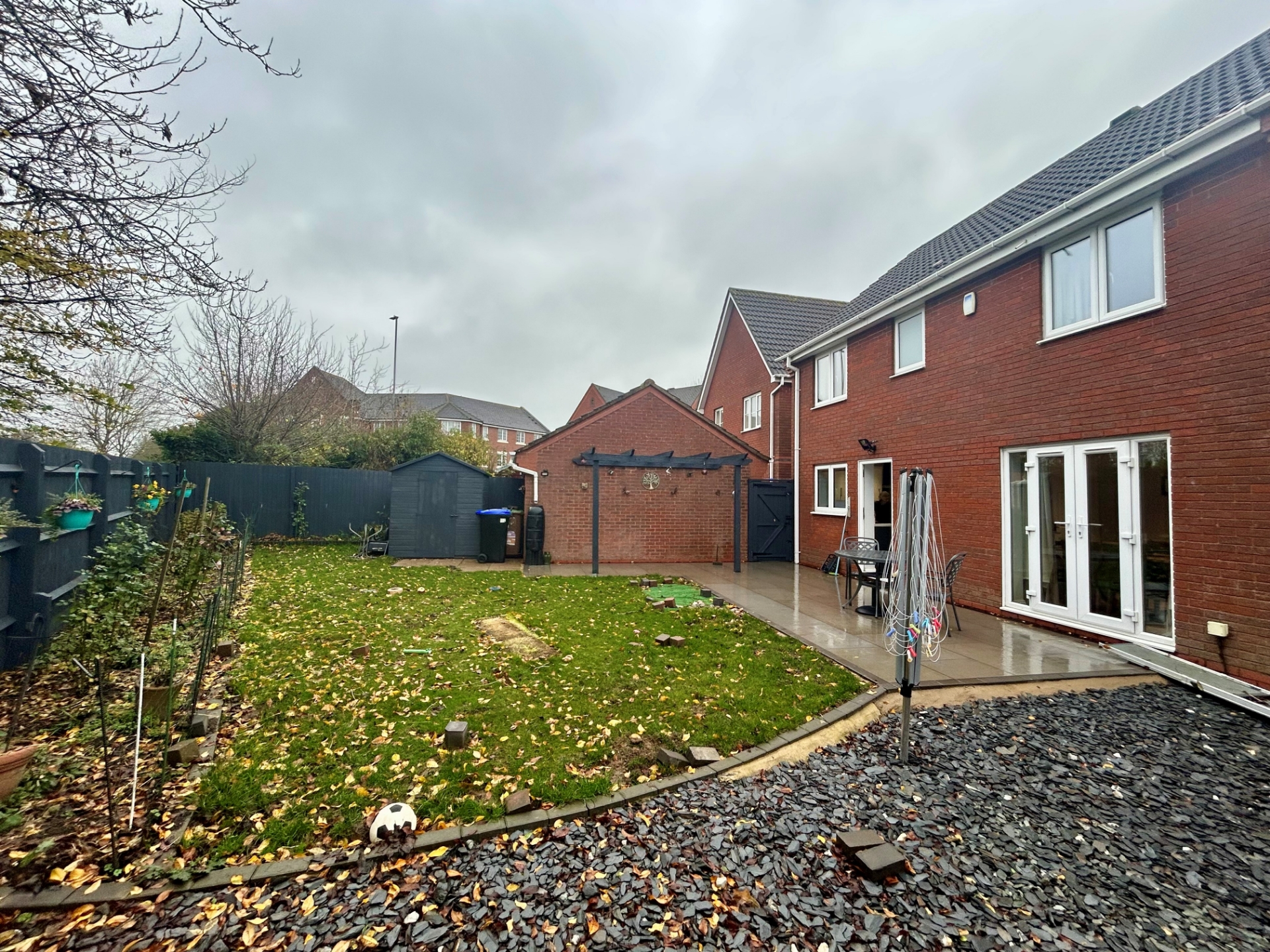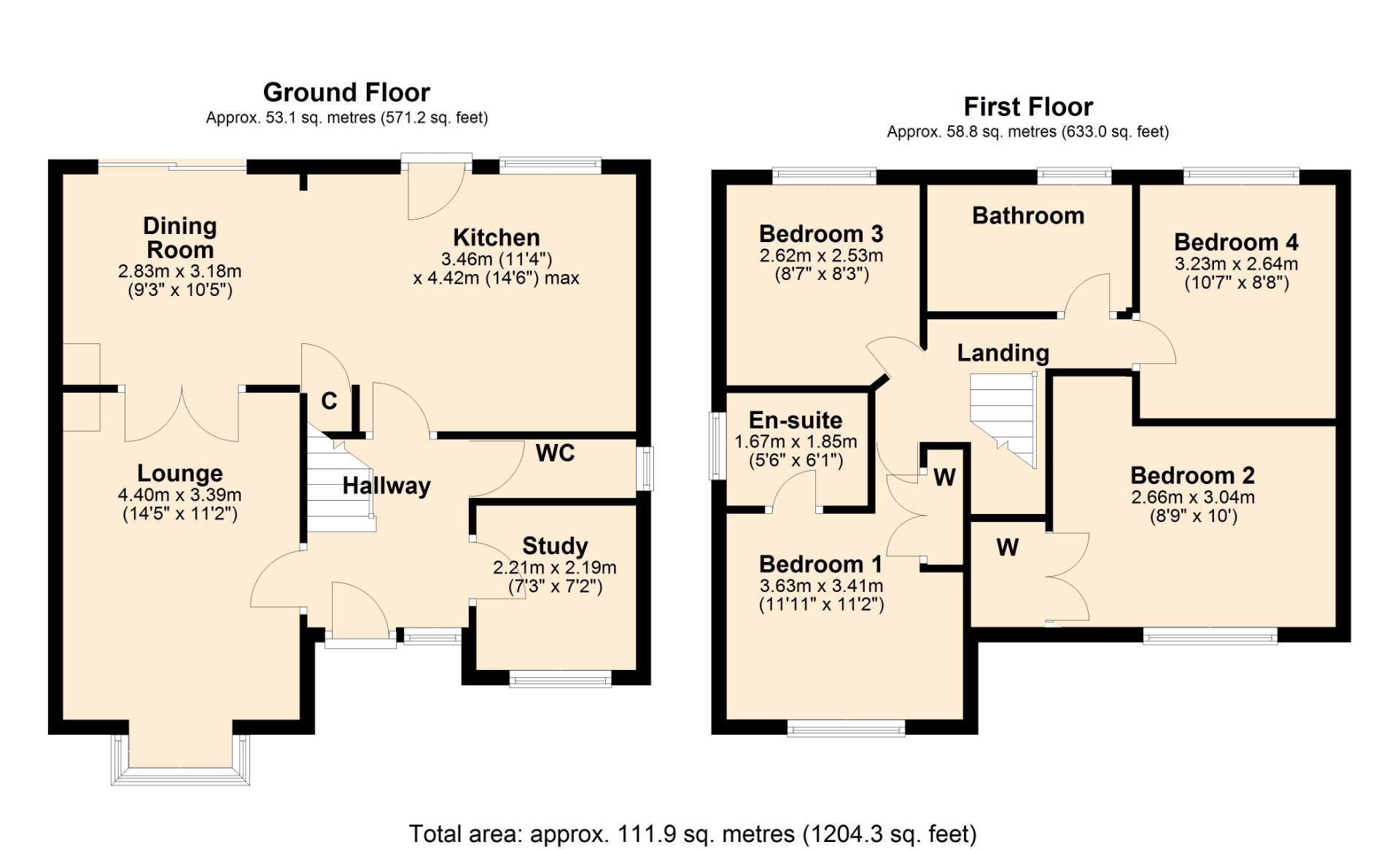 The ground floor comprises an inviting entrance hallway leading to a ground floor cloakroom, a separate study, and a spacious lounge with a feature box bay window. To the rear, the open-plan kitchen/diner provides an excellent space for both everyday living and entertaining. Upstairs, there are four well-sized bedrooms-three doubles and a generous single. Bedrooms one and two benefit from built-in wardrobes, with the master bedroom featuring an en-suite shower room, complemented by a contemporary family bathroom.