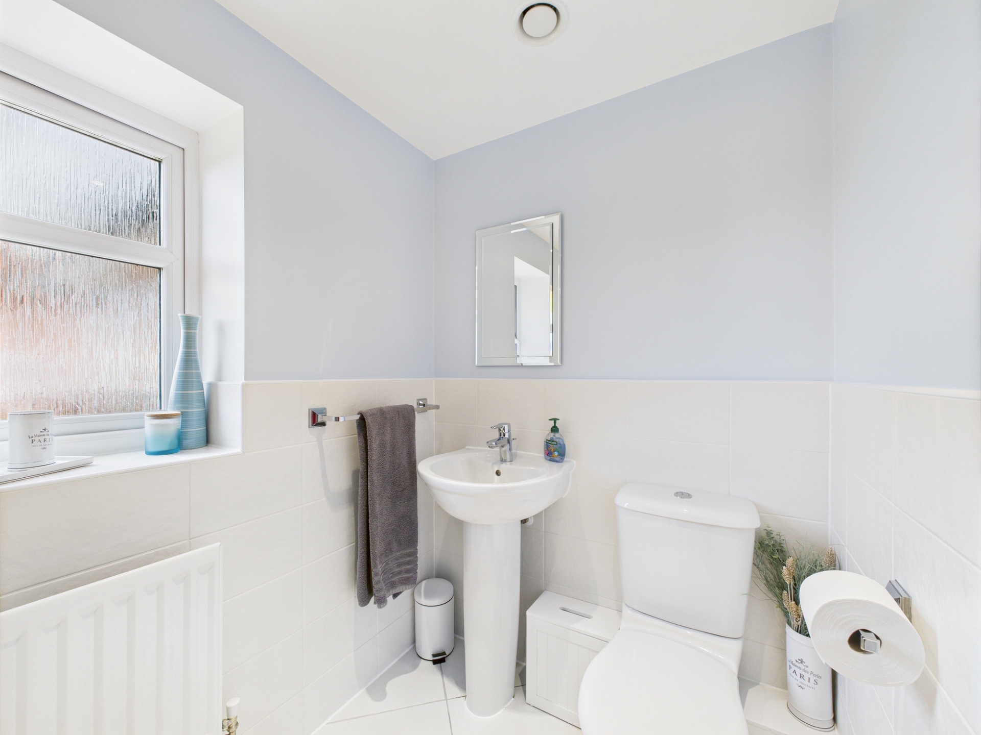 Radiator. WC and wash hand basin. Tiled floor. Tiled splash backs.