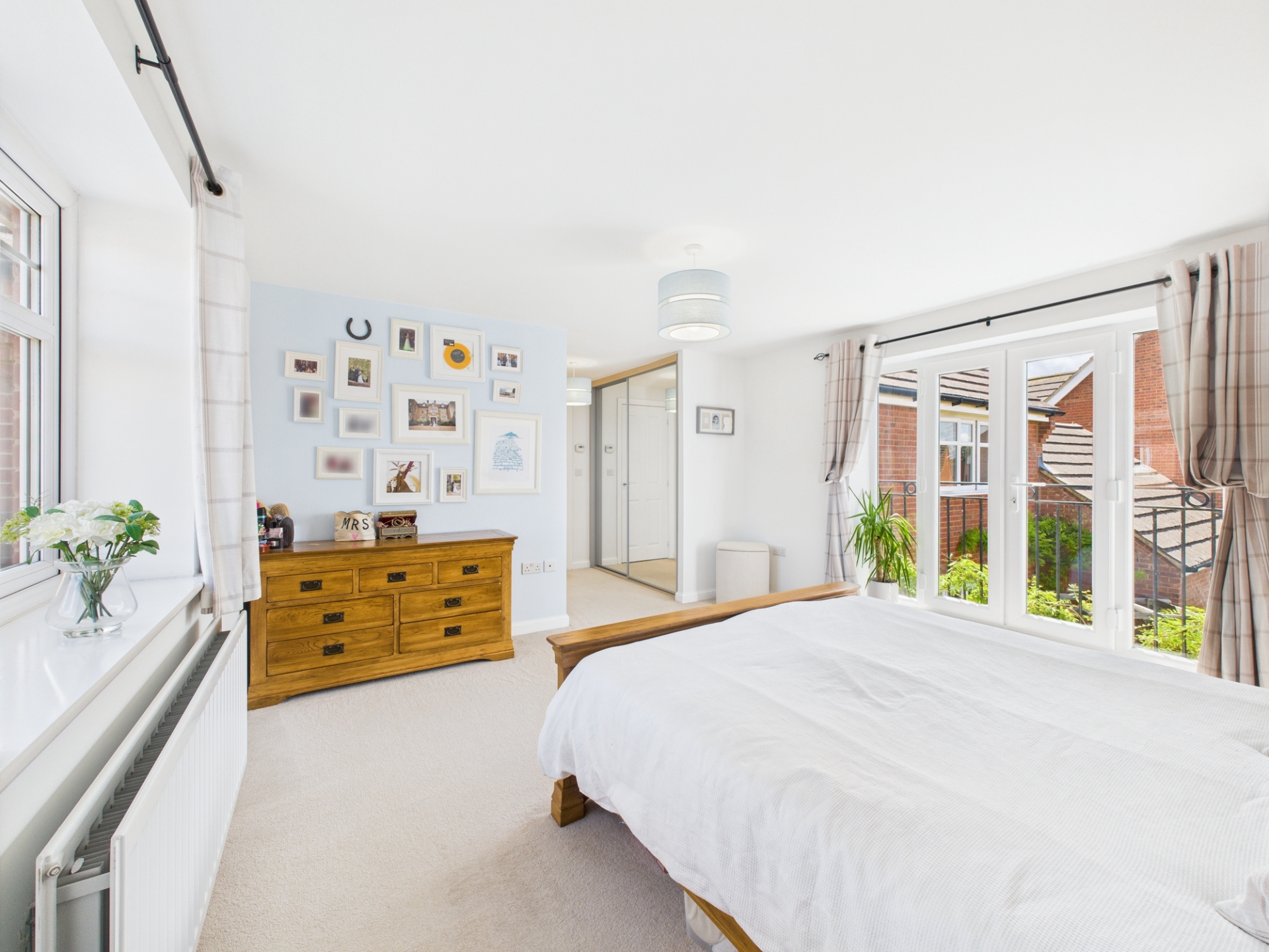 Window to side elevation. Double doors with Juliet balcony. Radiator. Built in wardrobes. Door to: