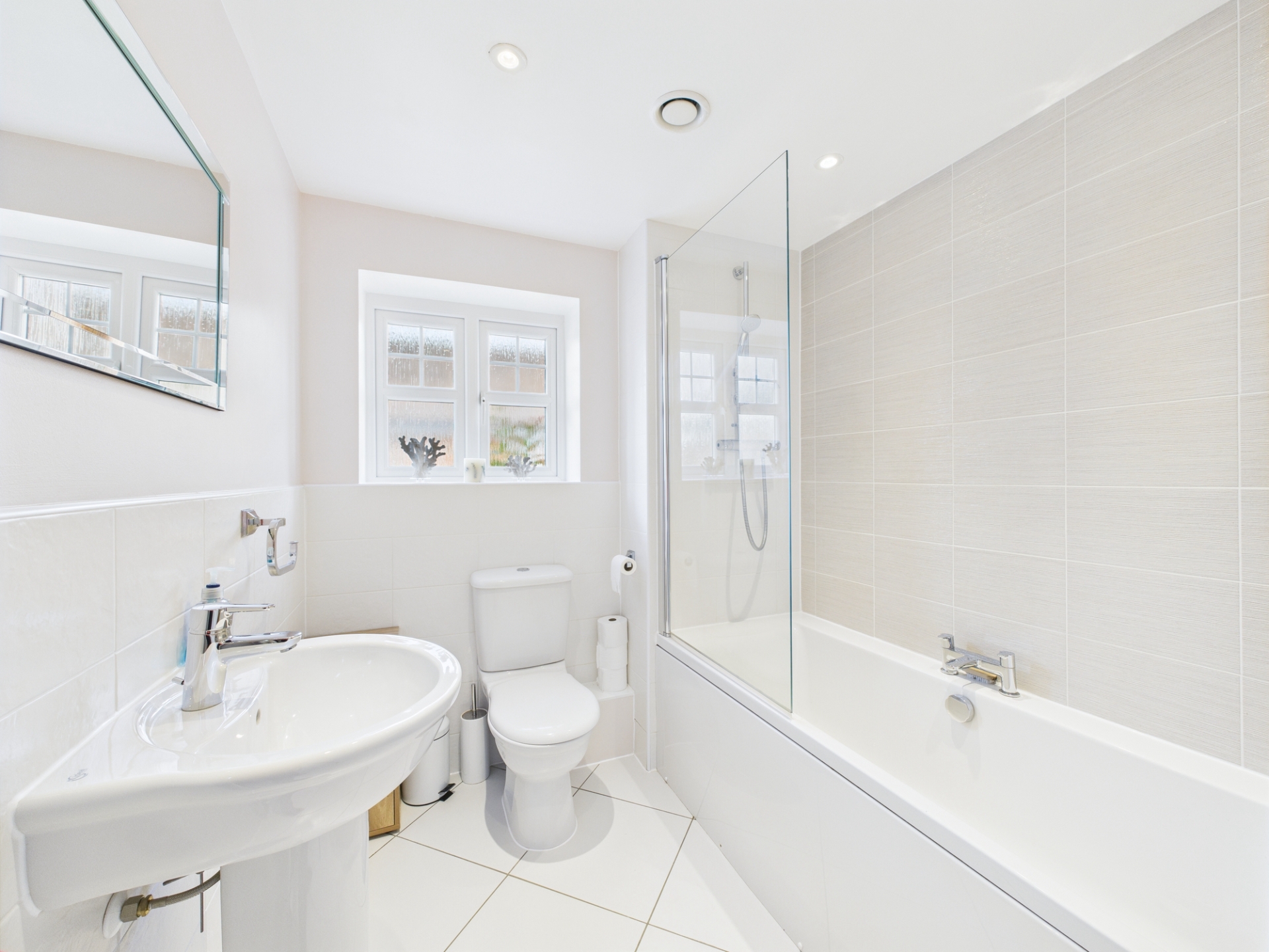 Window to side elevation. Chrome heated towel rail. Suite comprising bath with shower and screen over, WC and wash hand basin. Tiled splash backs. Tiled floor.
