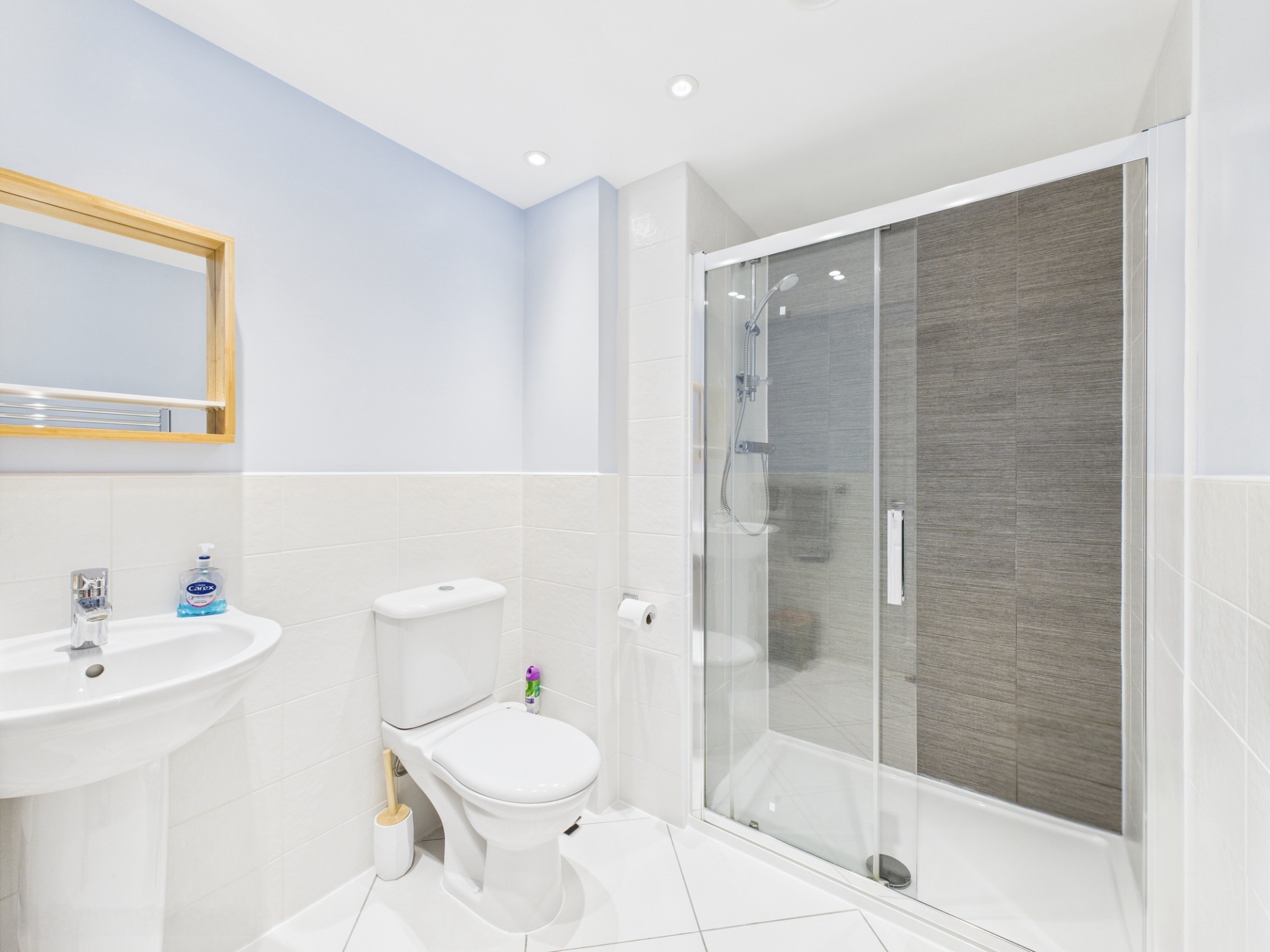 Chrome heated towel rail. Suite comprising shower in a large tiled cubicle, WC and wash hand basin. Tiled splash backs. Tiled floor.