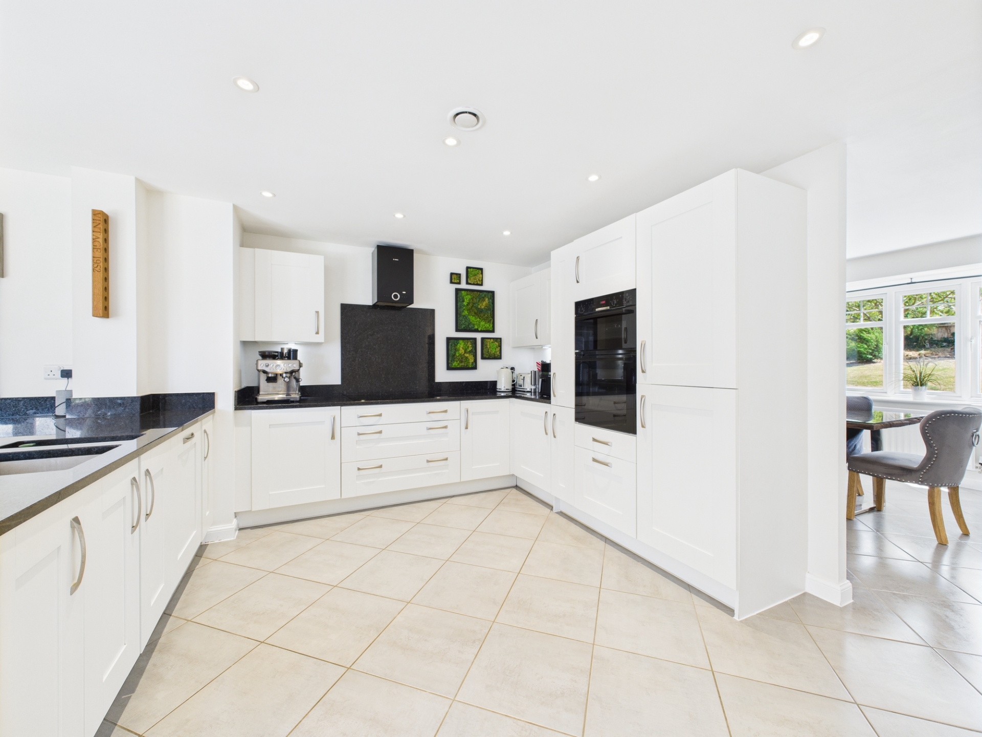 Windows to both side elevations. Two radiators. Fitted with a range of wall, base and drawer units with granite work top incorporating a breakfast bar. Integrated fridge, freezer and dishwasher. Built in oven, grill, induction hob and extractor hood. Underslung one and a half bowl sink and drainer unit. Tiled floor. Double doors to garden.