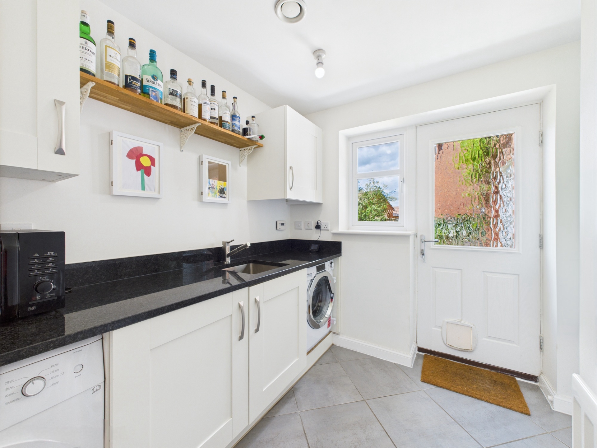 Window and door to rear elevation. Radiator. Fitted with a range of wall and base units with granite work tops. Space for washing machine and tumble dryer. Underslung stainless steel sink unit. Tiled floor. Understairs storage cupboard.