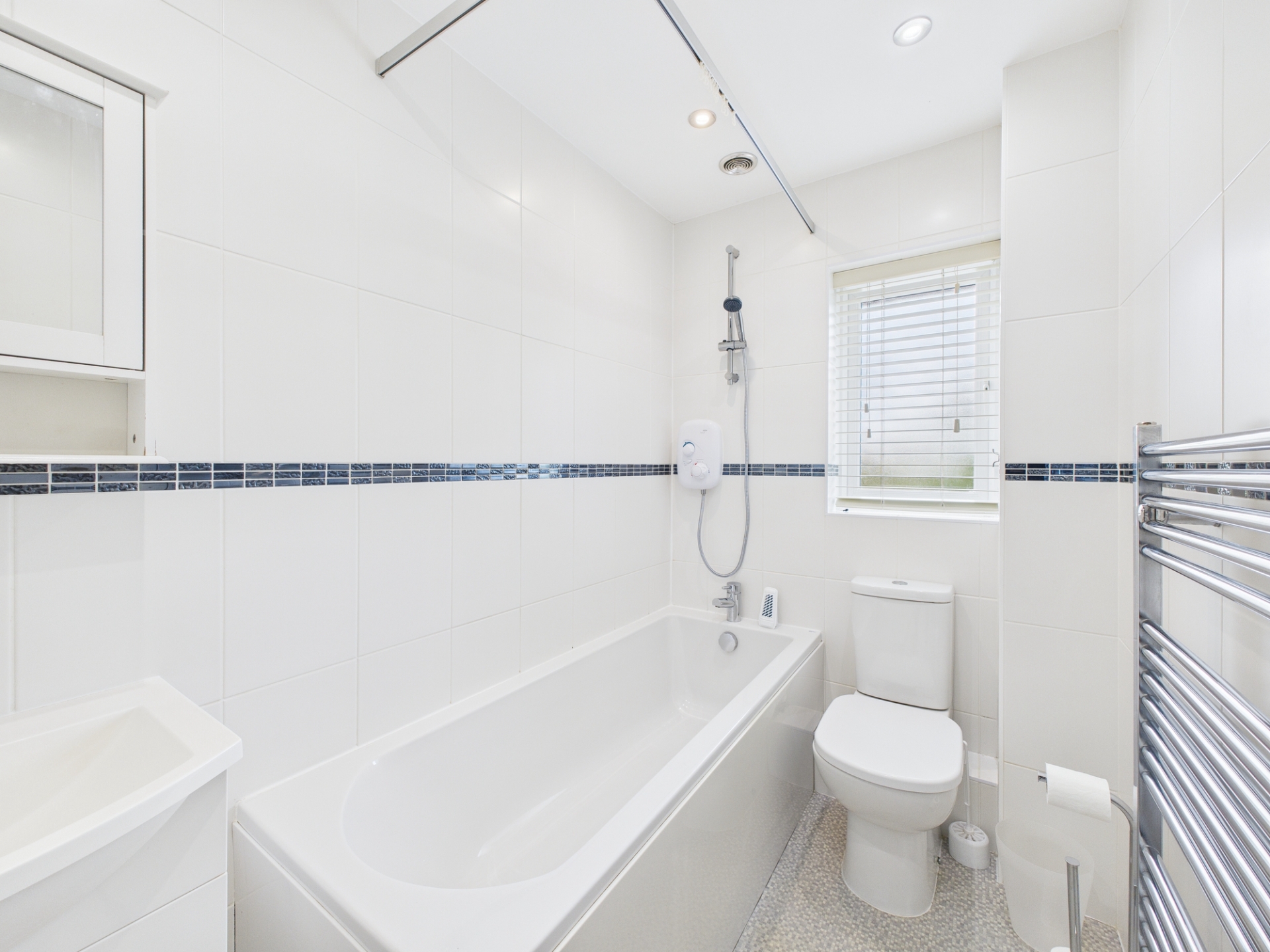 uPVC double glazed opaque window to rear elevation. Heated towel rail. Spotlights to ceiling. Three piece suite comprising panel bath with shower over, low level WC and wash hand basin in vanity unit. Shaver socket.
