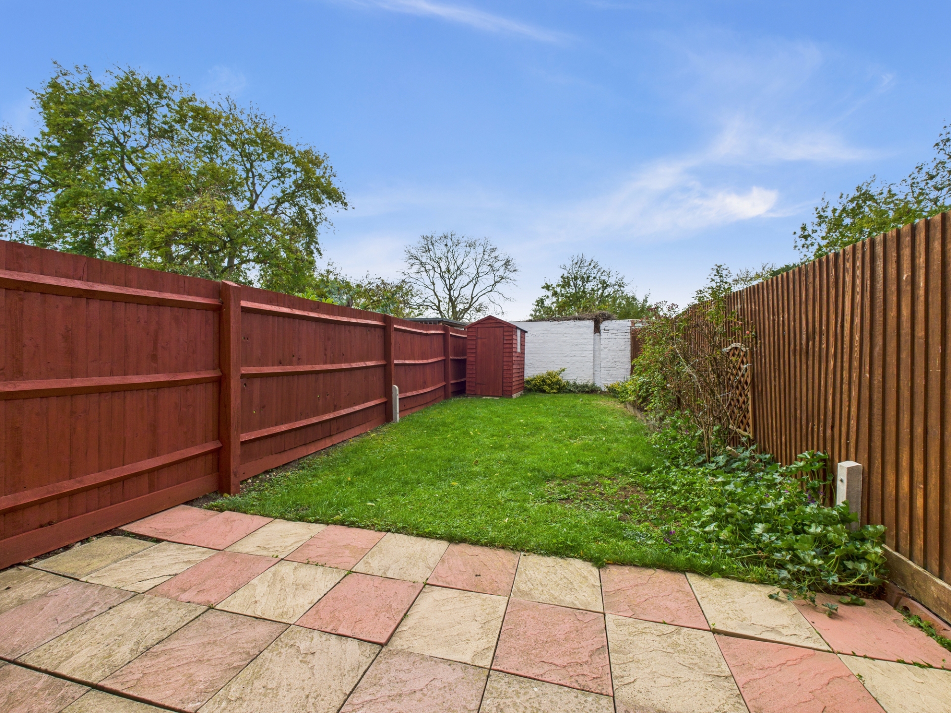 Enclosed by timber fencing to sides and brick wall to rear. Block paved patio area. Mainly laid to lawn. Hedgerow to right hand side. Outside lighting.