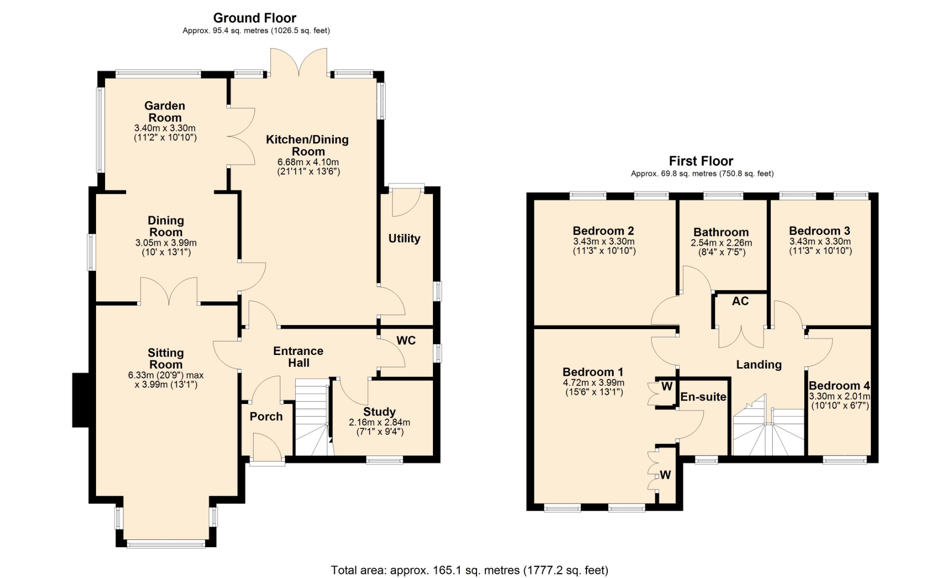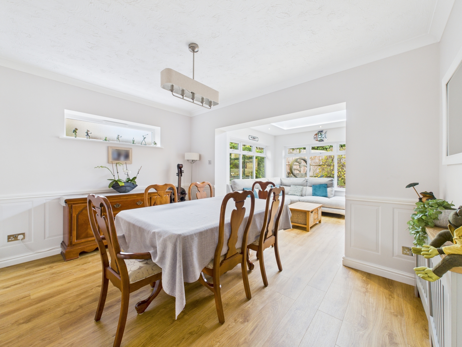 A separate utility room provides additional convenience for laundry and household tasks. From the kitchen, glazed double doors open into a bright garden room, which in turn flows into a spacious dining room ideal for family gatherings and entertaining. Further glazed doors lead to the generous living room, complete with an attractive bay window to the front aspect. The ground floor also includes a well-equipped study and a stylish cloakroom.