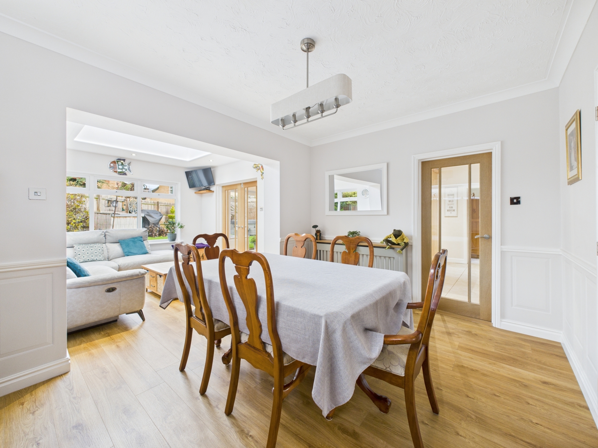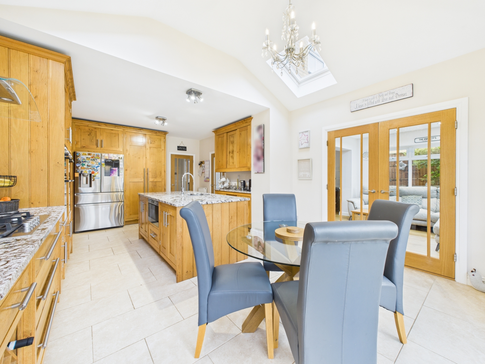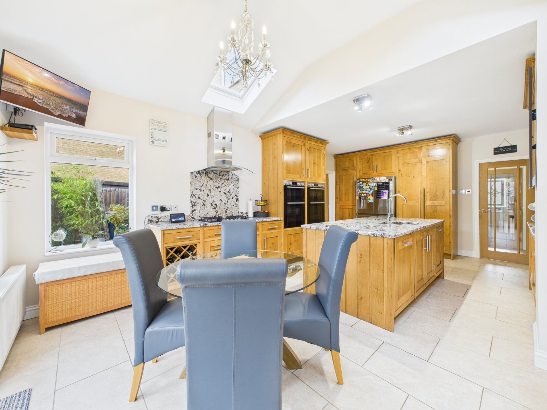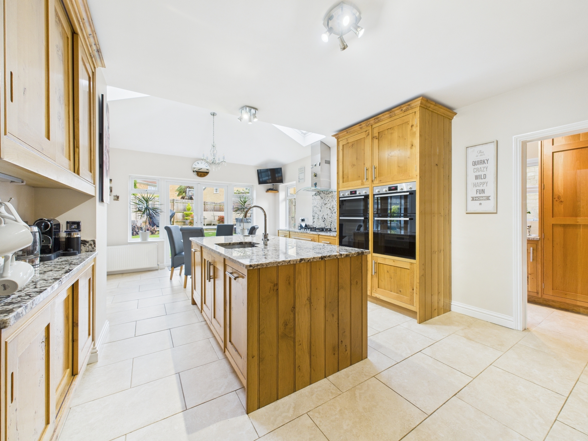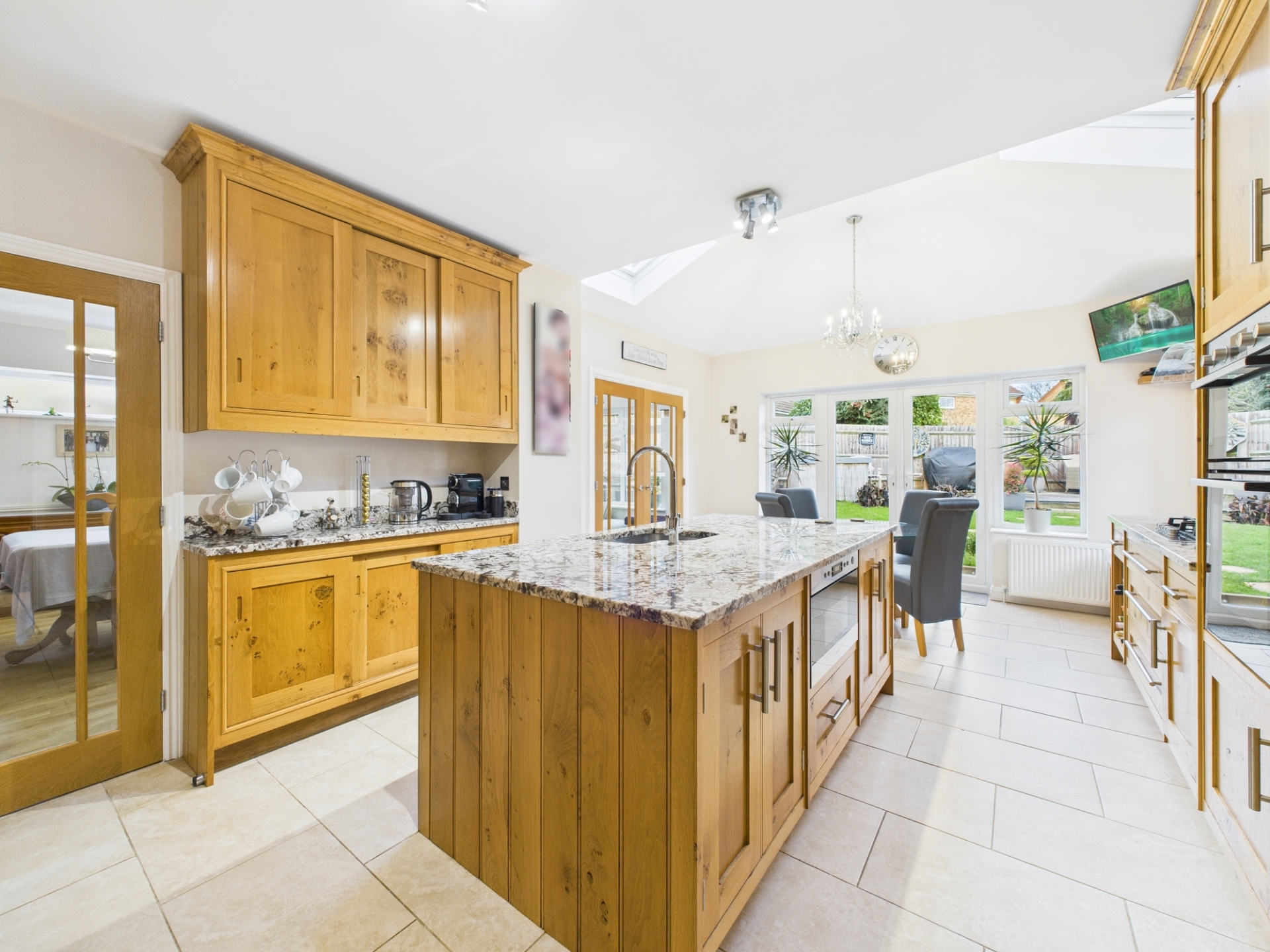 Upon entering, you are immediately drawn through the hallway into the breathtaking kitchen a true centrepiece of the home. This stunning space boasts a vaulted ceiling, bespoke oak cabinetry, granite worktops, a large central island, two double ovens, gas hob with hood, microwave, and dishwasher.