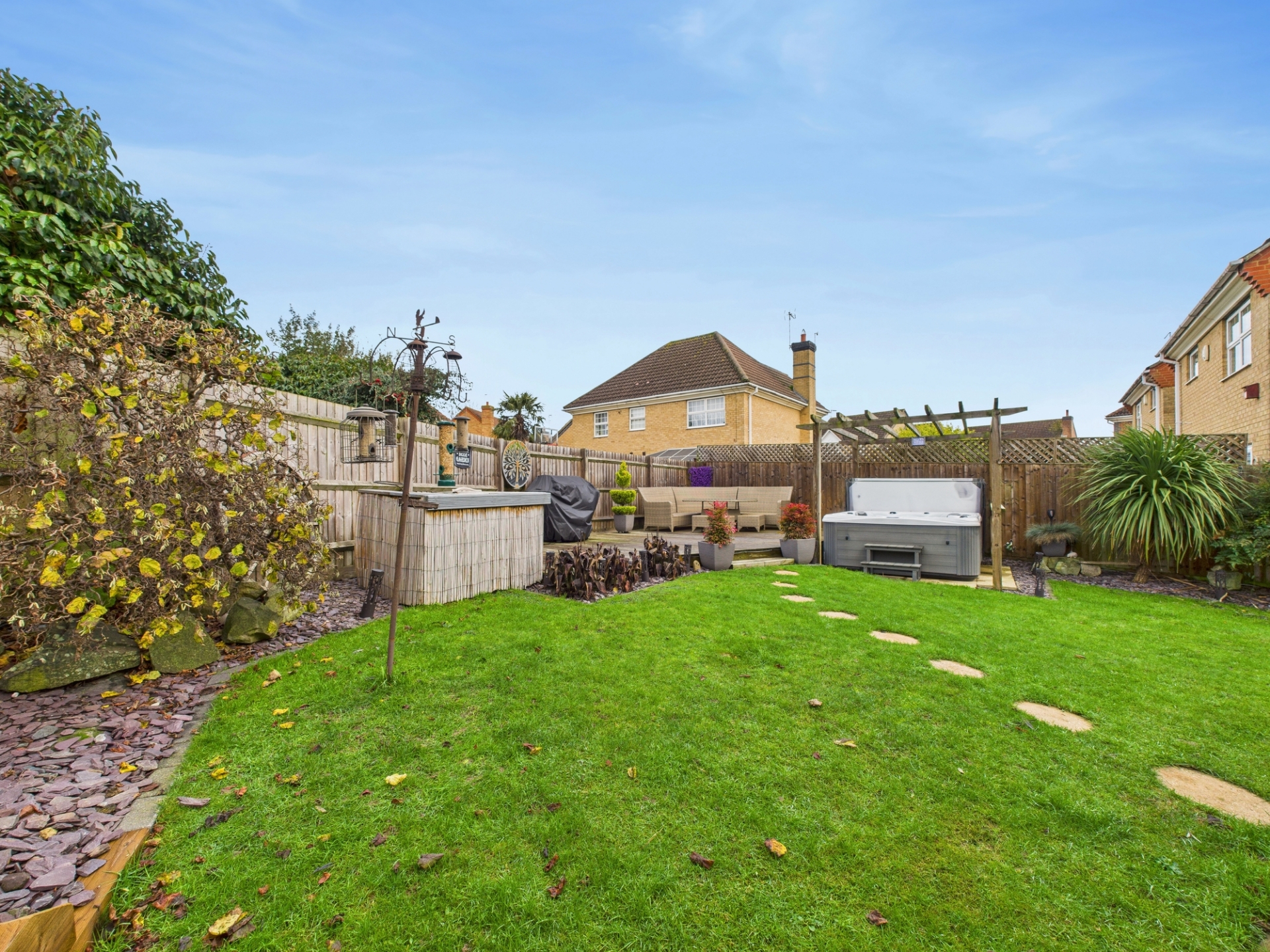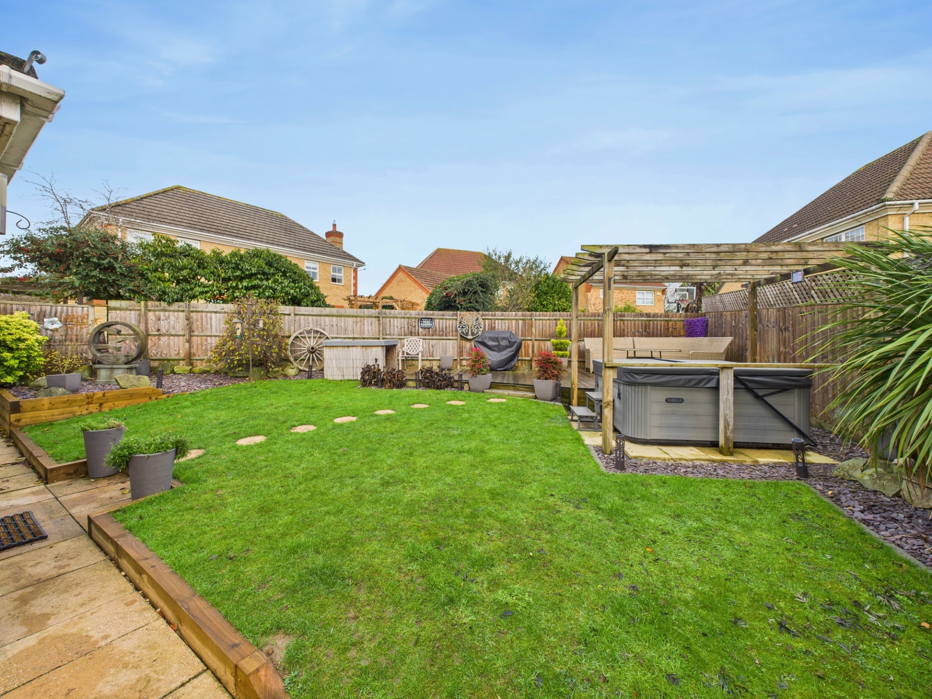 Outside, the property enjoys a neat front garden with lawn and hedge borders, along with a double-width tarmac driveway leading to a detached double garage. The rear garden has been thoughtfully landscaped, featuring a large lawn, raised decked area perfect for entertaining, and a hardstanding ideal for a hot tub.