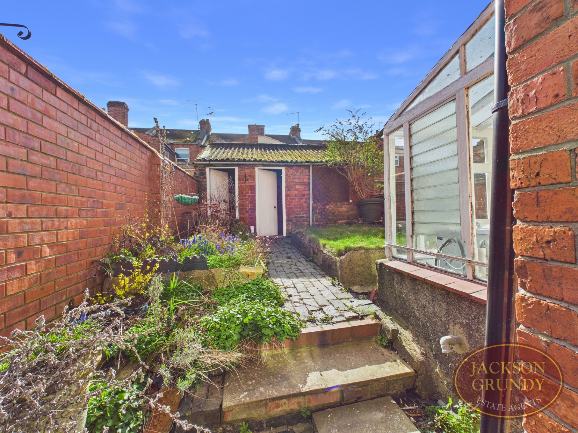 Outside is an average garden for this style of property with part walled boundary, and a most useful, full width, two compartment outbuilding.