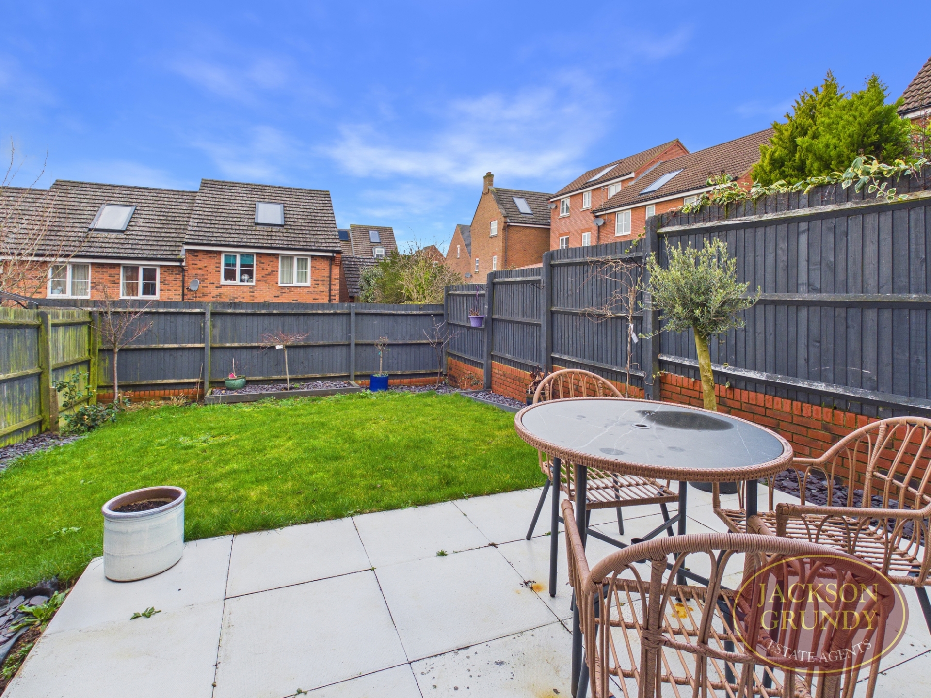 Fully enclosed rear garden featuring a paved patio, neat lawn and established borders, offering a private and pleasant outdoor space for relaxing or entertaining.