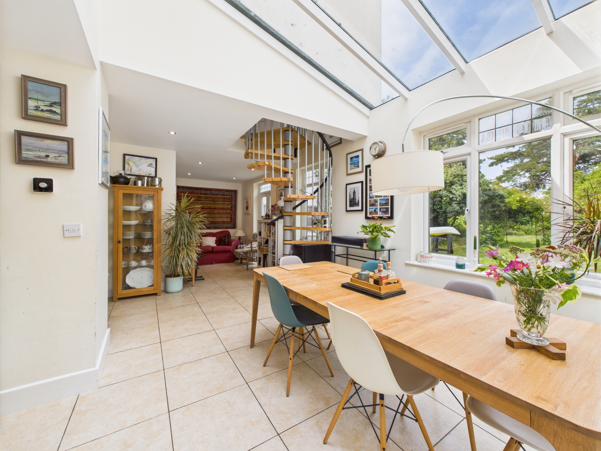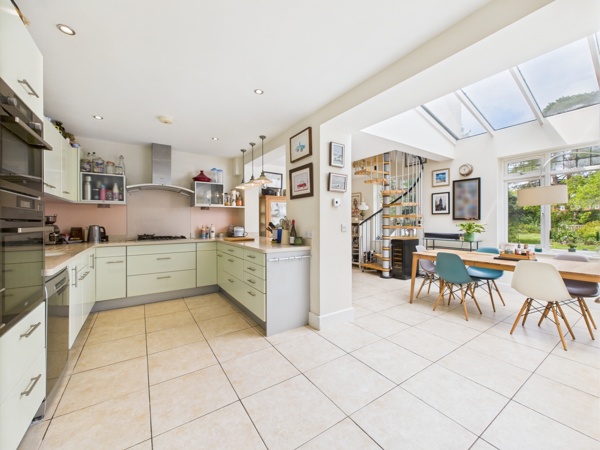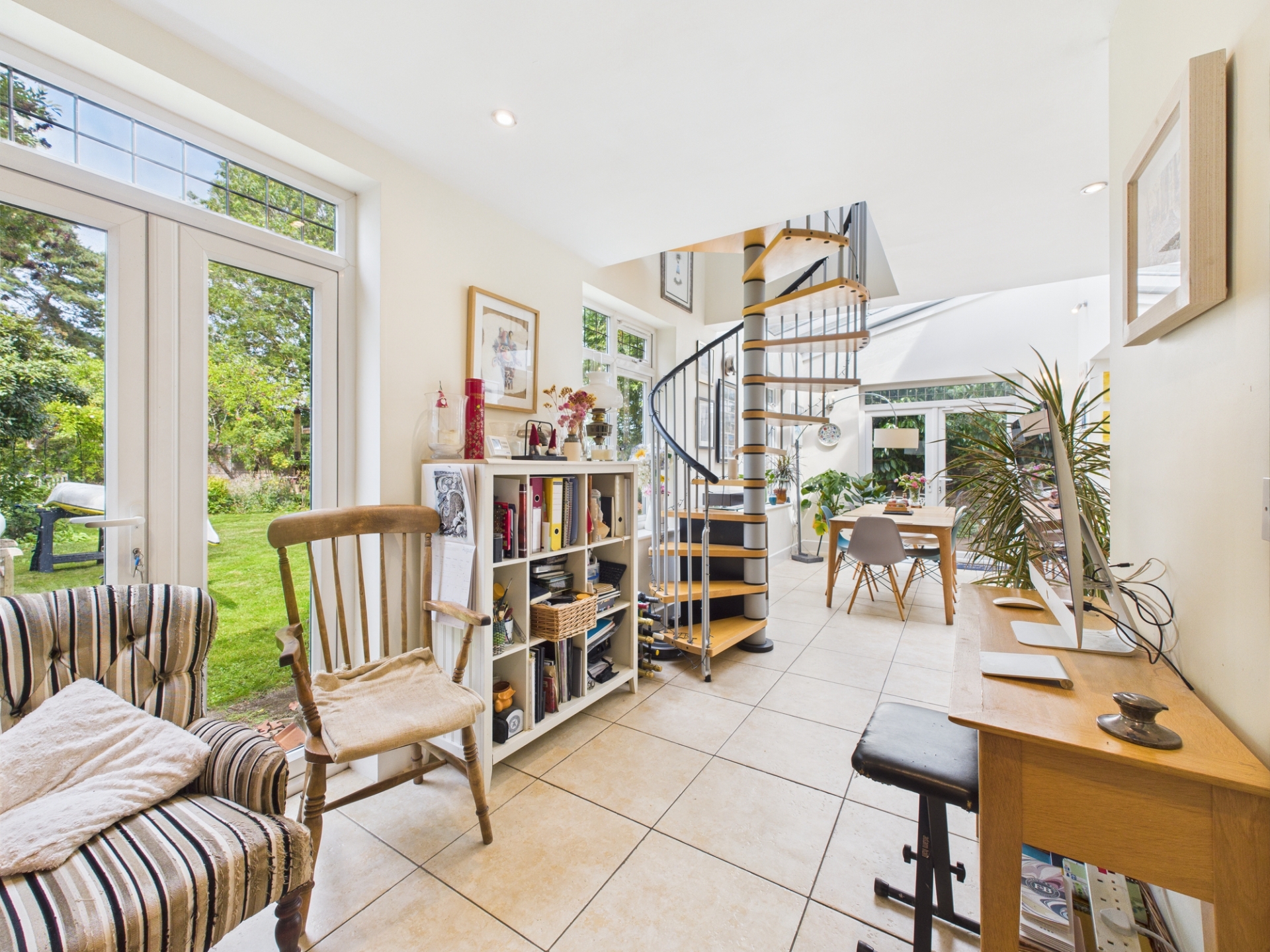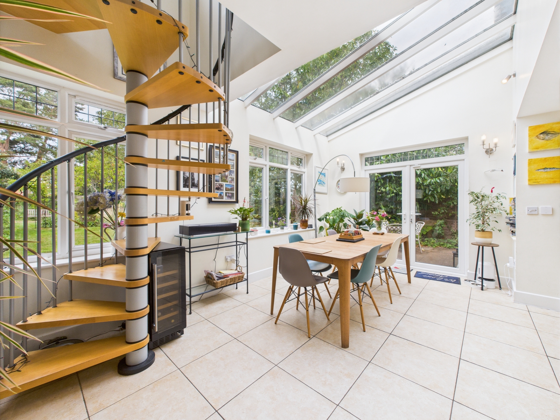 The ground floor is arranged around three main living spaces. A bright, dual aspect living room with wooden flooring and a log-burning stove creates a cosy yet elegant feel. Across the hall, the snug, currently used as a music room, features a large bay window and continued wooden flooring. To the rear, the extended kitchen dining family room is the heart of the home, complete with integrated appliances, a glass roof dining area with underfloor heating, and French doors opening onto the garden. A spiral staircase from here leads to the fifth bedroom with its own en-suite wet room. Beyond the kitchen is a utility room, cloakroom, and access to the garage.