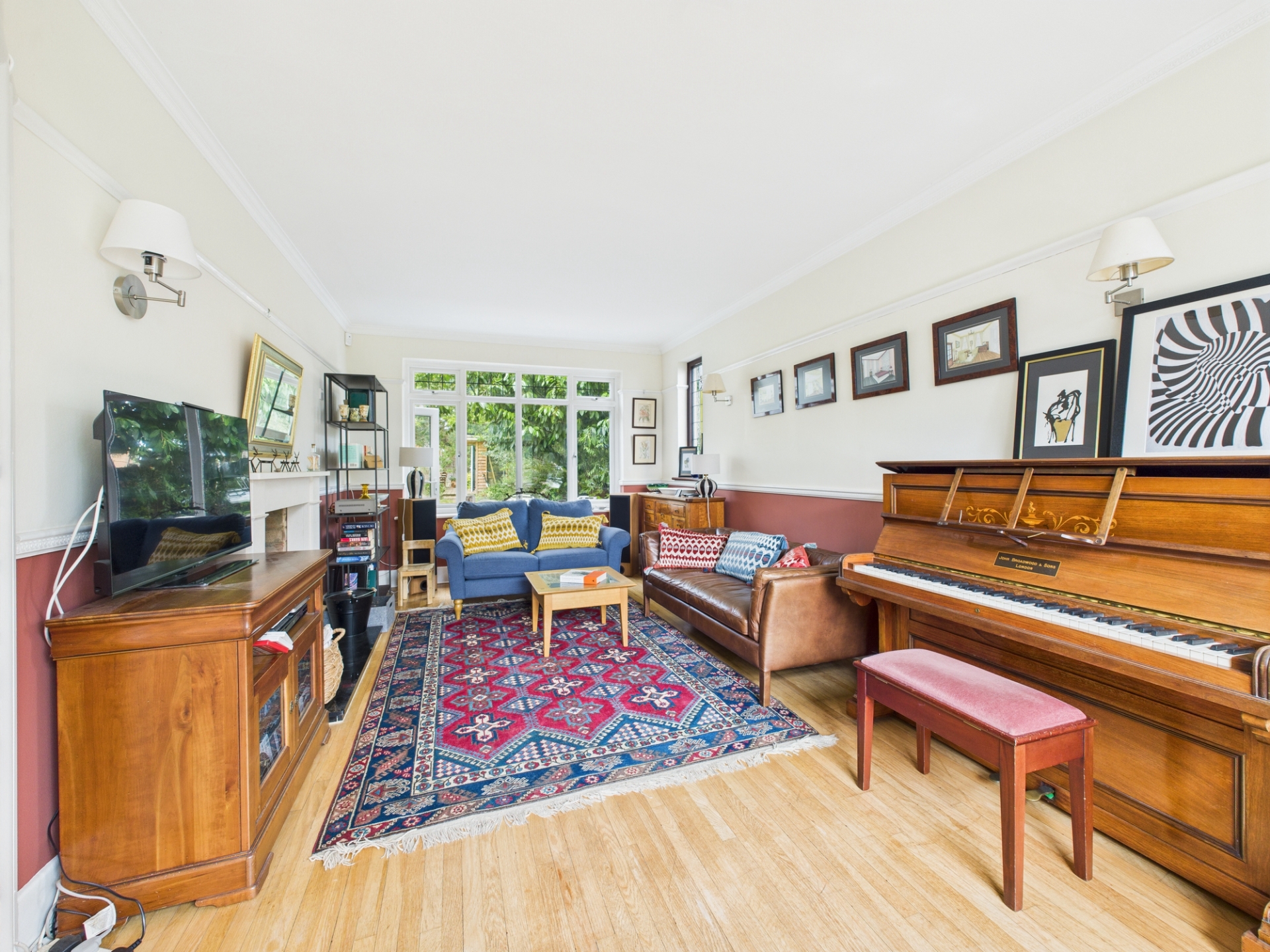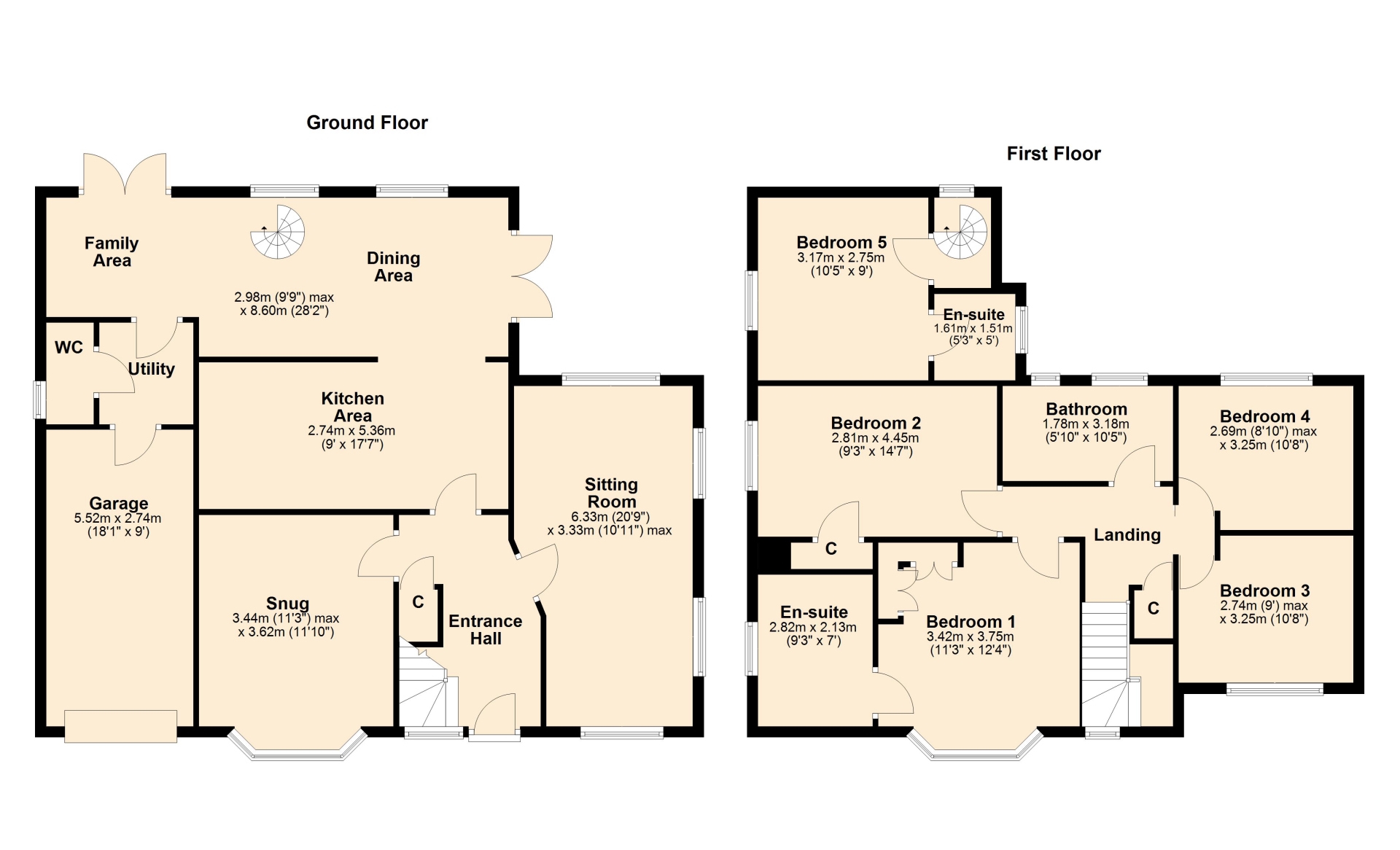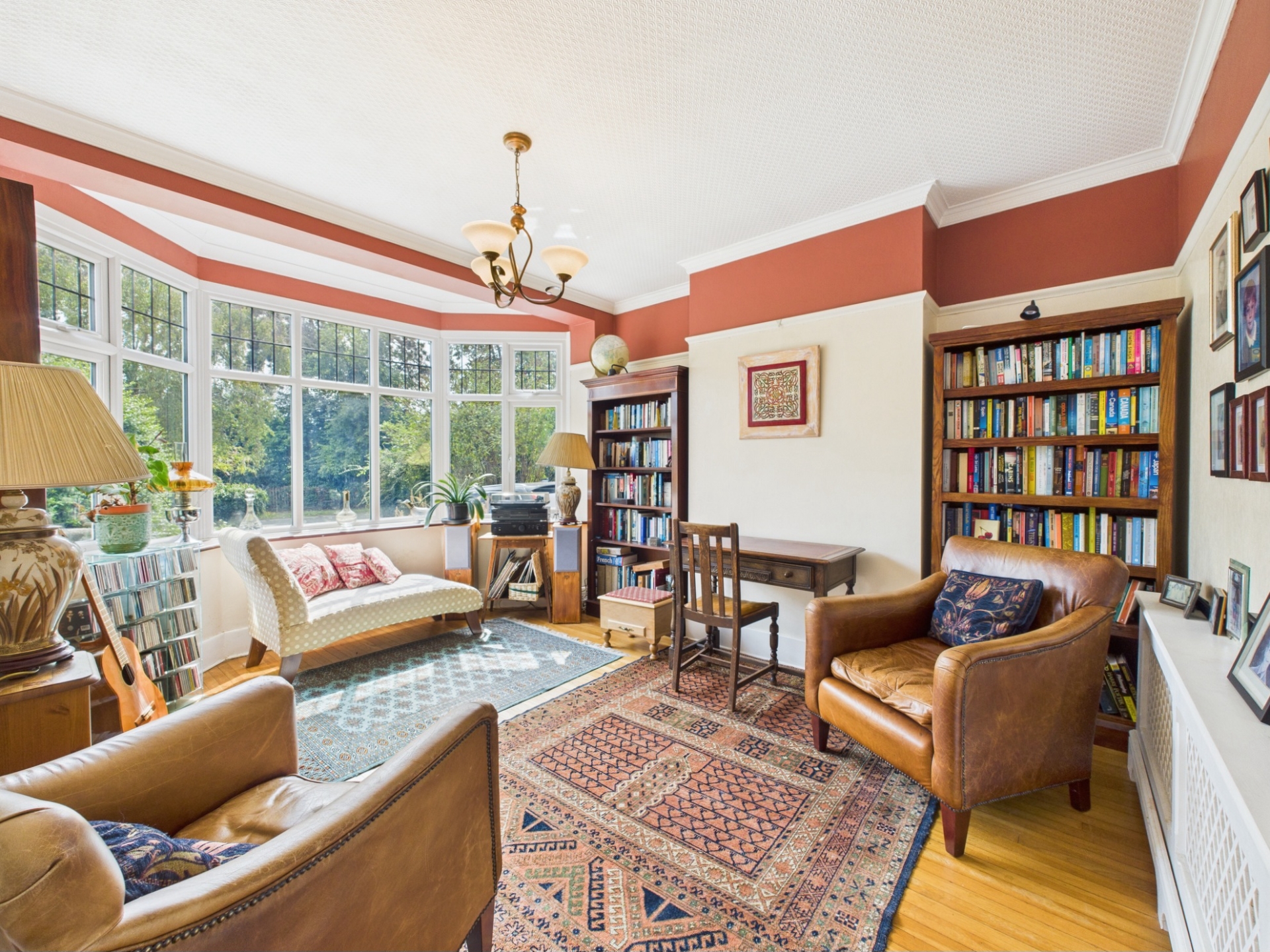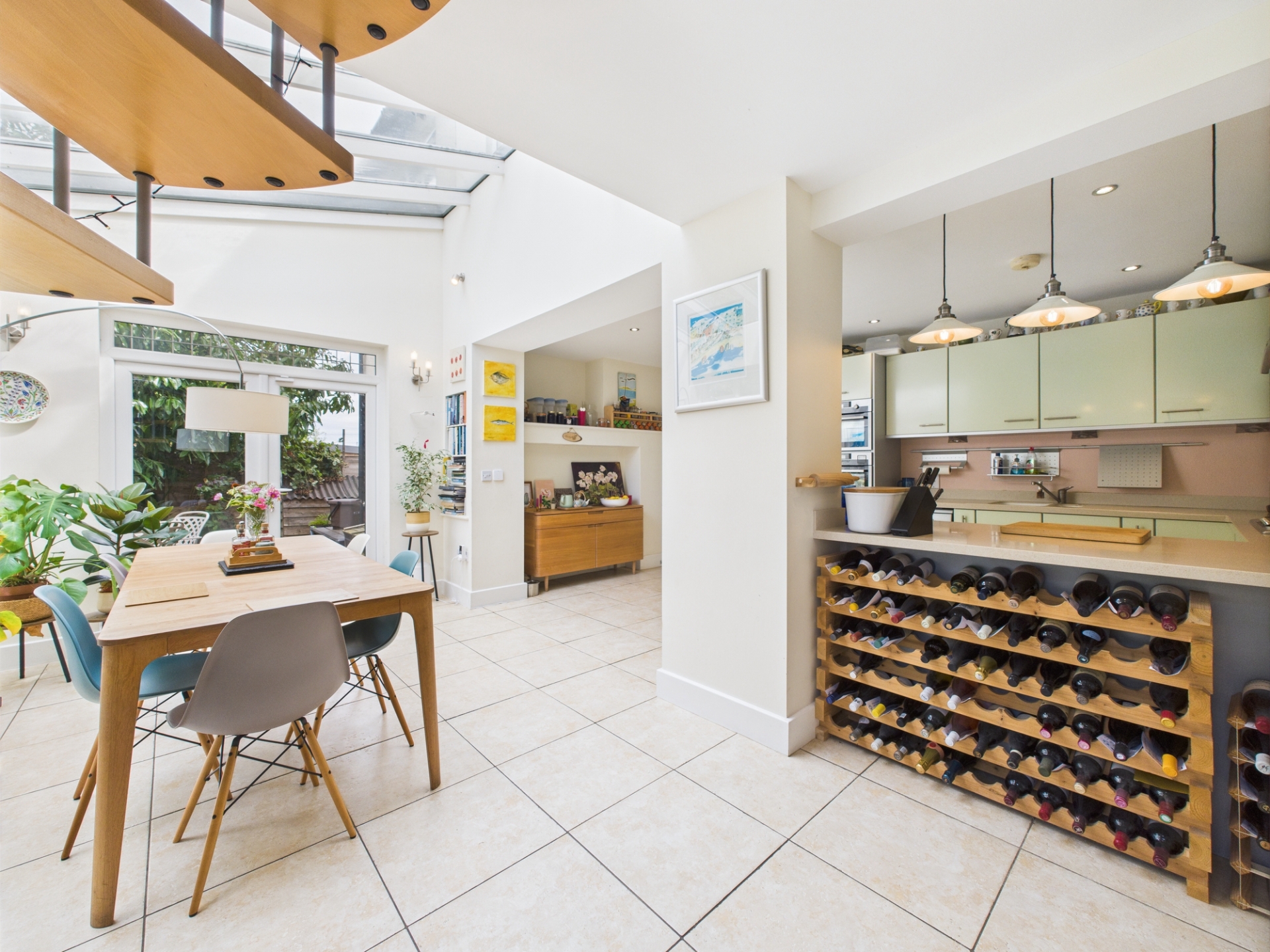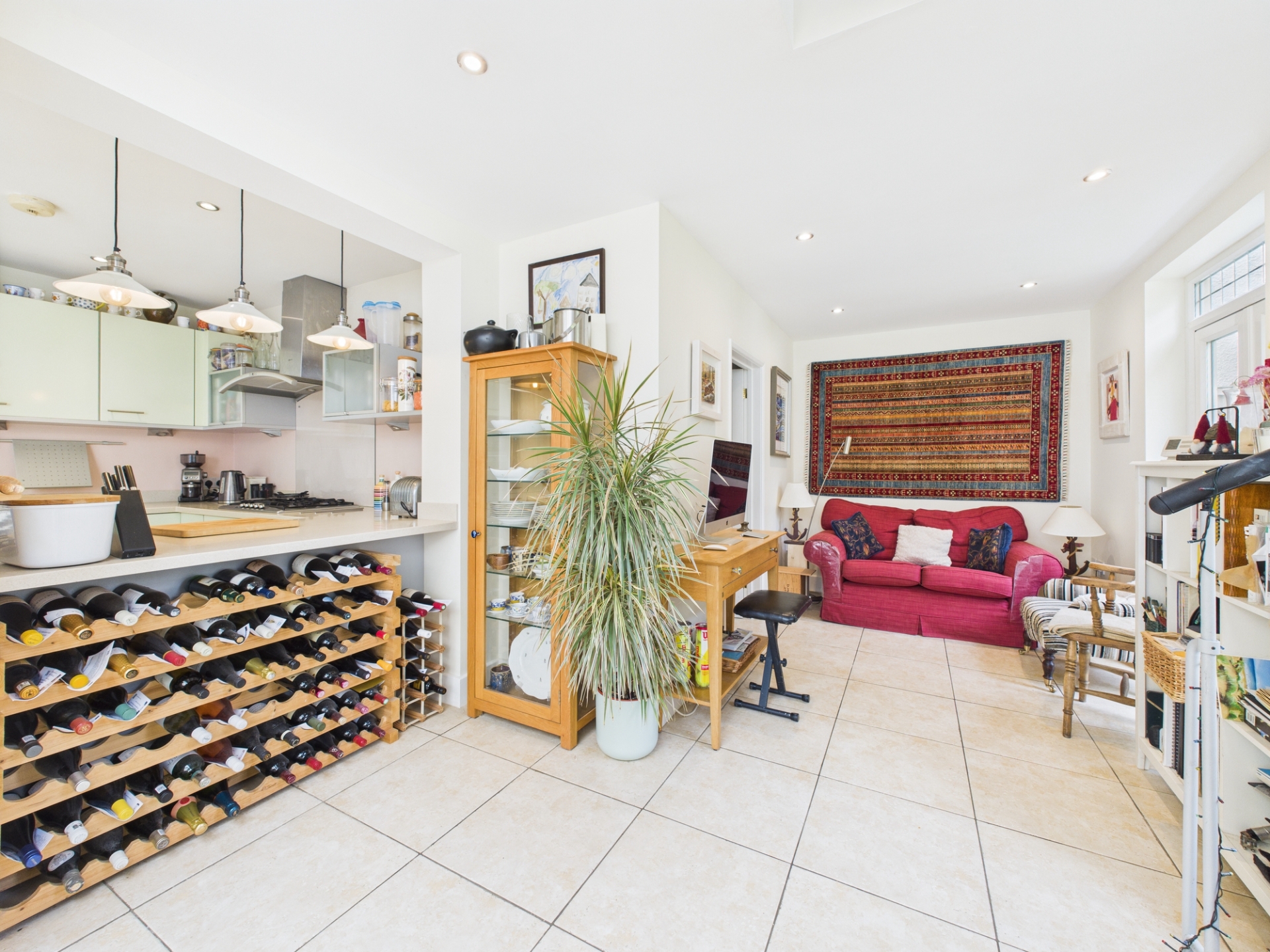 The ground floor is arranged around three main living spaces. A bright, dual aspect living room with wooden flooring and a log-burning stove creates a cosy yet elegant feel. Across the hall, the snug, currently used as a music room, features a large bay window and continued wooden flooring. To the rear, the extended kitchen dining family room is the heart of the home, complete with integrated appliances, a glass roof dining area with underfloor heating, and French doors opening onto the garden. A spiral staircase from here leads to the fifth bedroom with its own en-suite wet room. Beyond the kitchen is a utility room, cloakroom, and access to the garage.