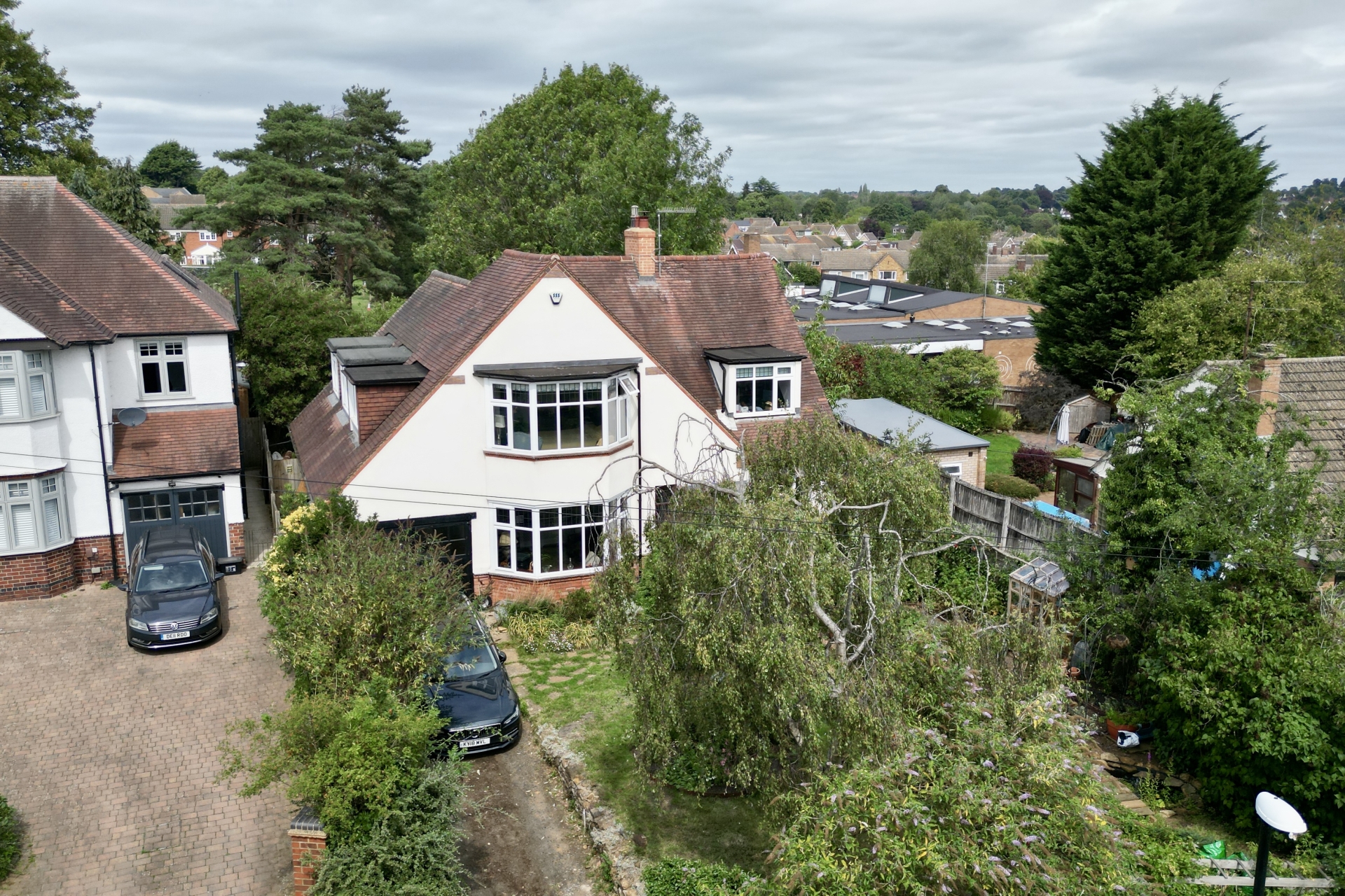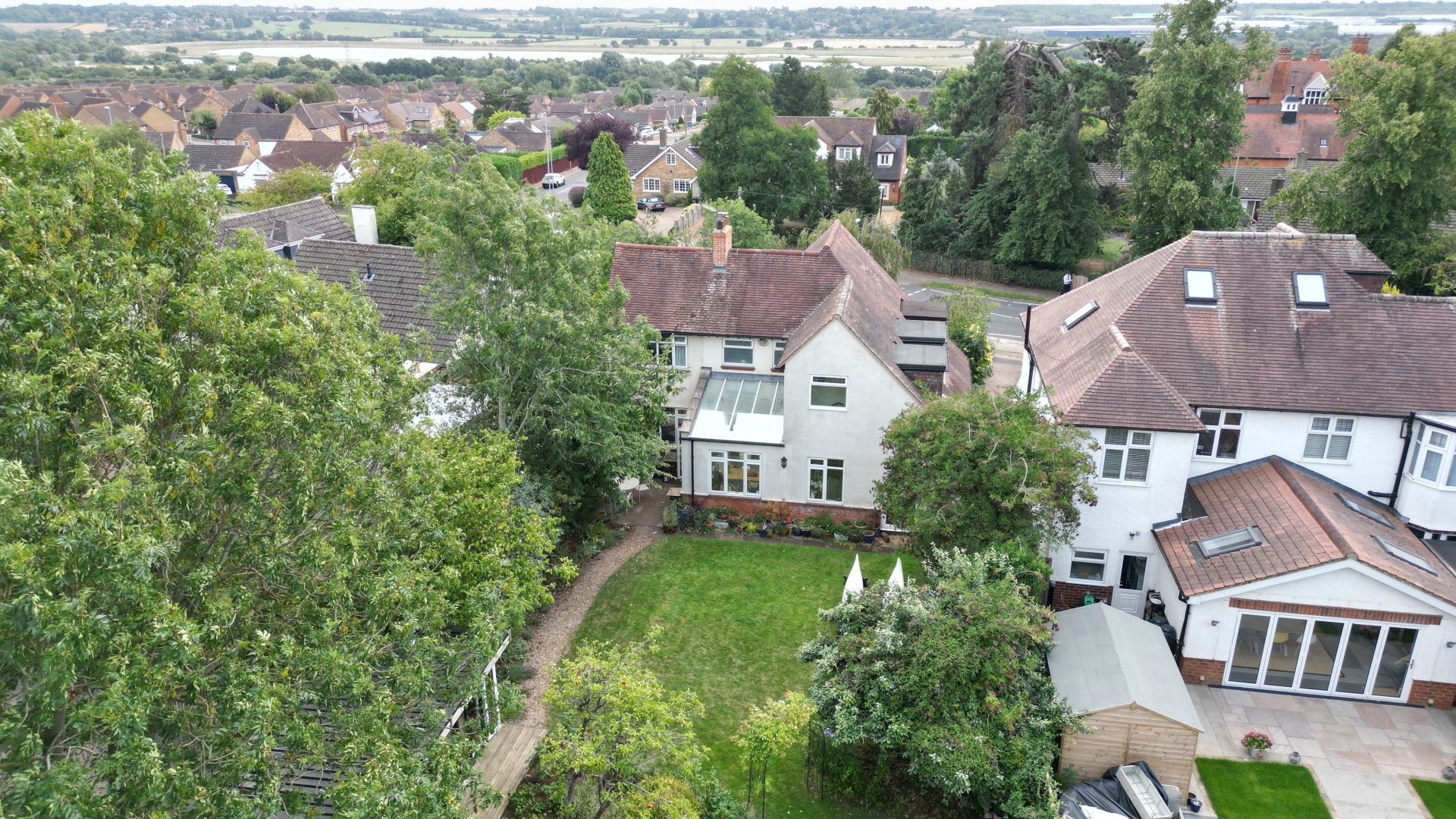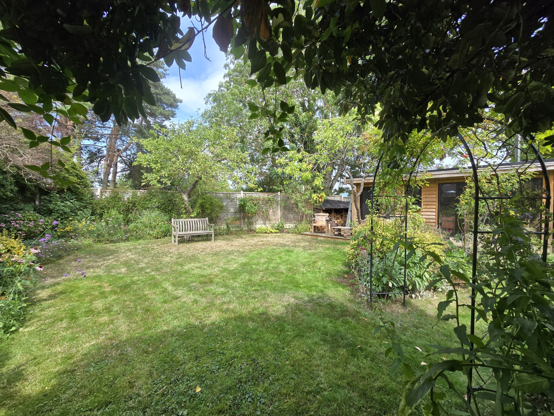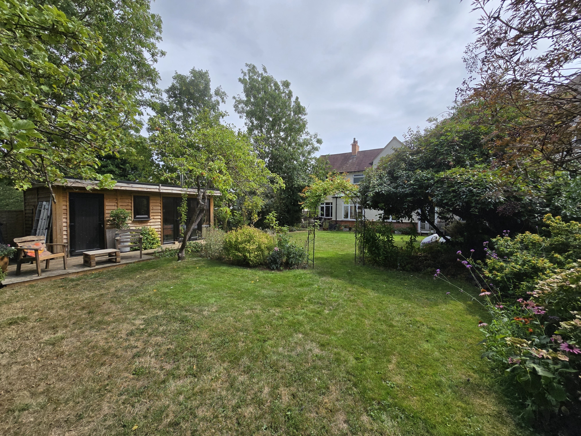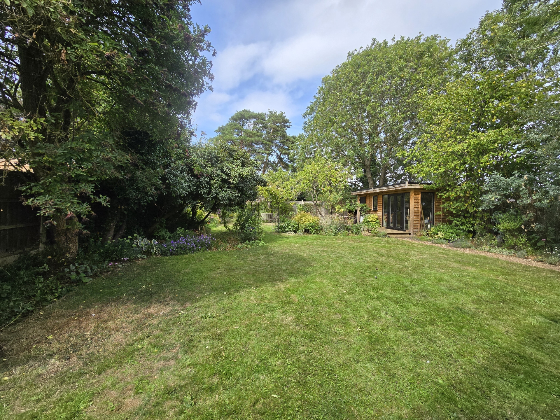 The property sits well back from the road behind a large lawned front garden with mature planting, trees, and a driveway for two cars. The rear garden offers privacy and space, featuring a paved terrace off the kitchen, a lawn with gravel path, and well-stocked borders. At the far end is a recently constructed outbuilding with a log-burning stove-perfect as a workshop, home office, gym, or playroom-alongside an additional shed.
