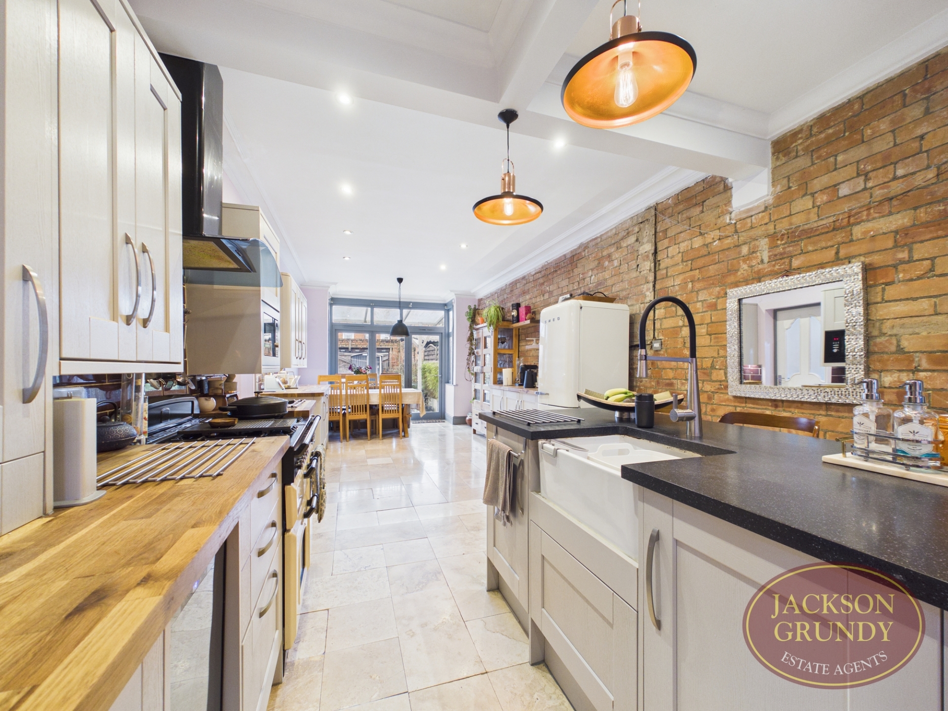 The ground floor accommodation comprises entrance porch and welcoming hallway, leading to a spacious bay fronted sitting room with dining area, featuring character fireplaces, original architrave and stripped floorboards. To the rear is a stunning refitted kitchen/breakfast room with central island and breakfast bar, a striking exposed brick feature wall and bi-fold doors opening onto the garden. A side extension further enhances the space, providing utility room, a contemporary shower room and access to a substantial cellar.