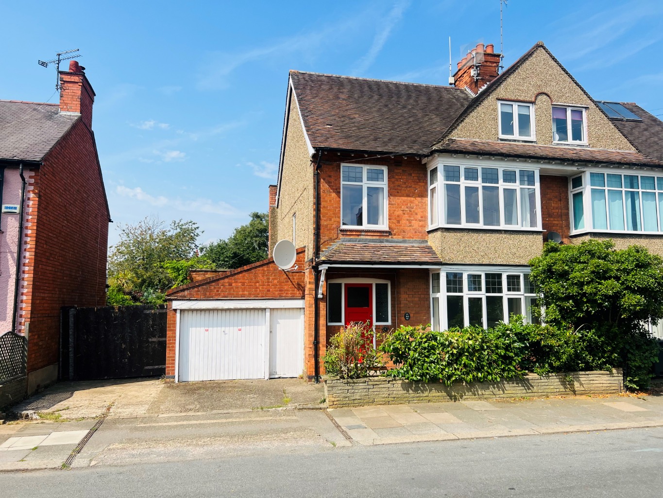 Double driveway with access to front door, garage and side garden.
