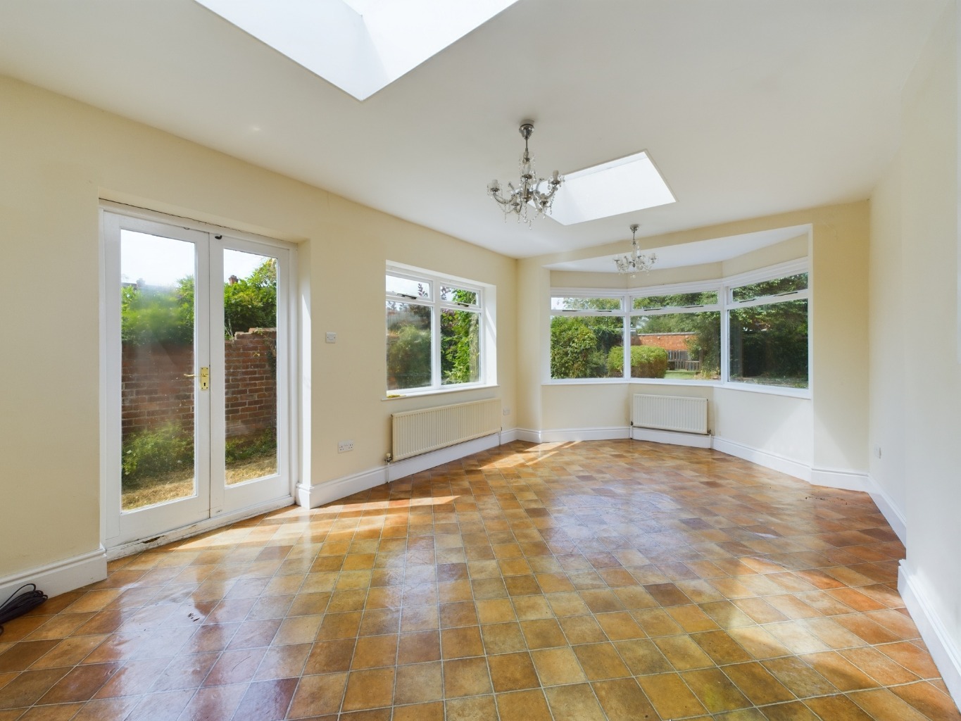 Bay window to rear elevation. Window and door to side elevation. Two skylights. Two radiators.
