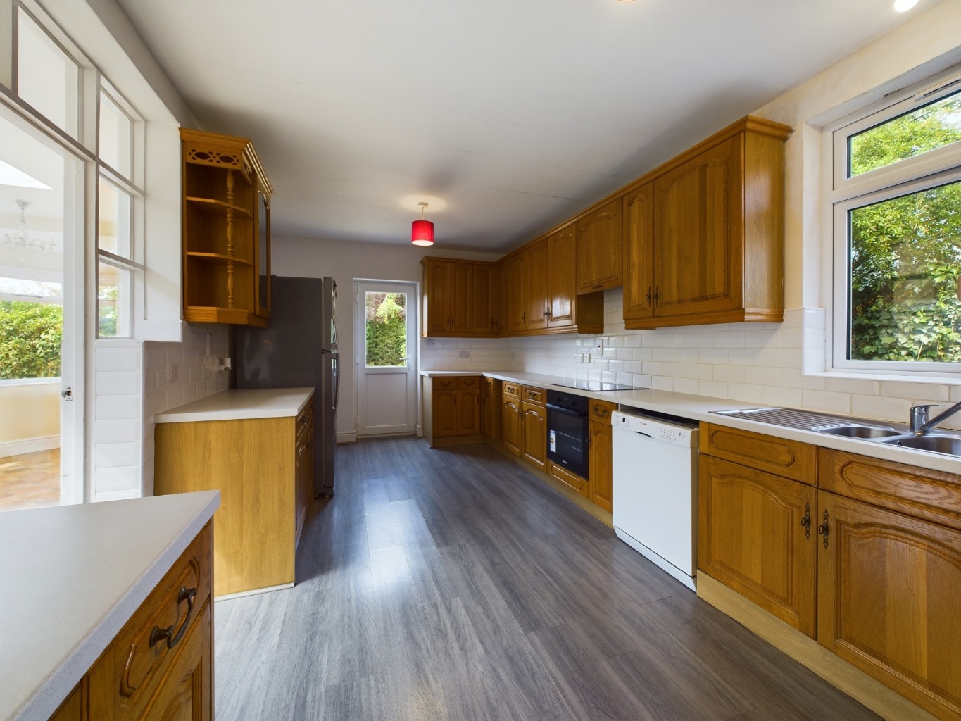 A range of wall and base units with roll top work surfaces over. Stainless steel sink. Tiling to splash back areas. Space for American style fridge/freezer, dishwasher and built in oven, hob and extractor.