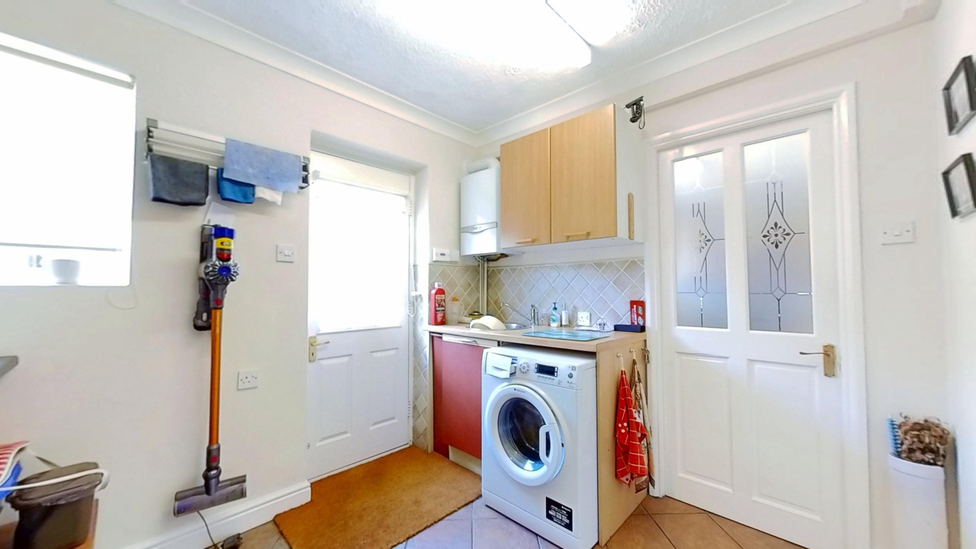 UPVC double glazed window to rear elevation. Fitted range of wall mounted and base units with roll top work surface. Inset circular bowl sink with mixer tap. Plumbing for a washing machine. Space for a tumble dryer. Wall mounted gas fired boiler. Tiled floor. Door to garage. UPVC double glazed door to rear elevation, leading to the rear garden.