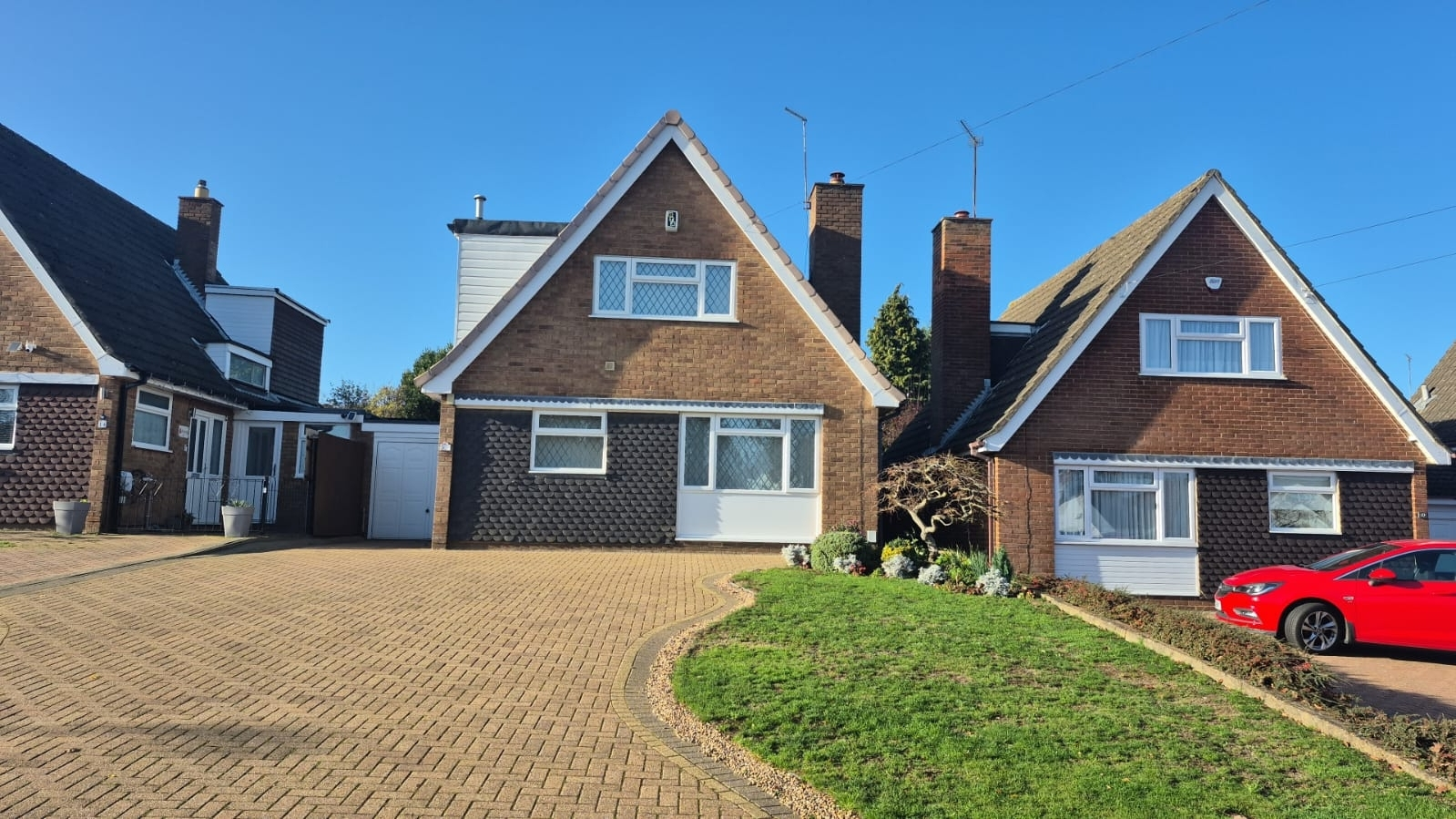 A block paved driveway provides off road parking for several cars and leads to the garage. There are shaped lawns with flower and shrub beds.