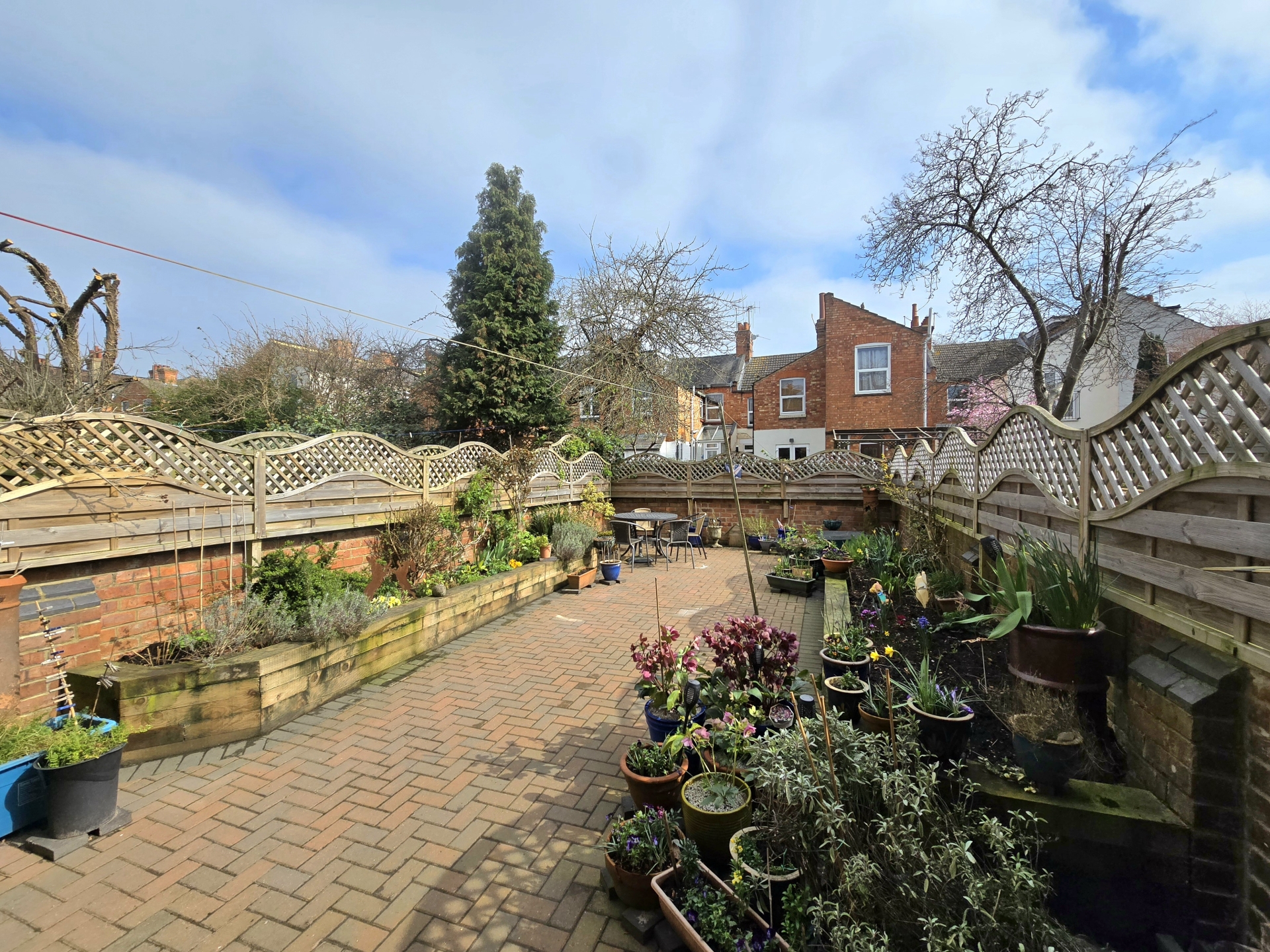 Enclosed by brick wall and timber trellis. Mainly block paved. Raised flower beds. Gravelled area. Iron staircase rising to first floor. Outdoor tap. Outdoor lighting.