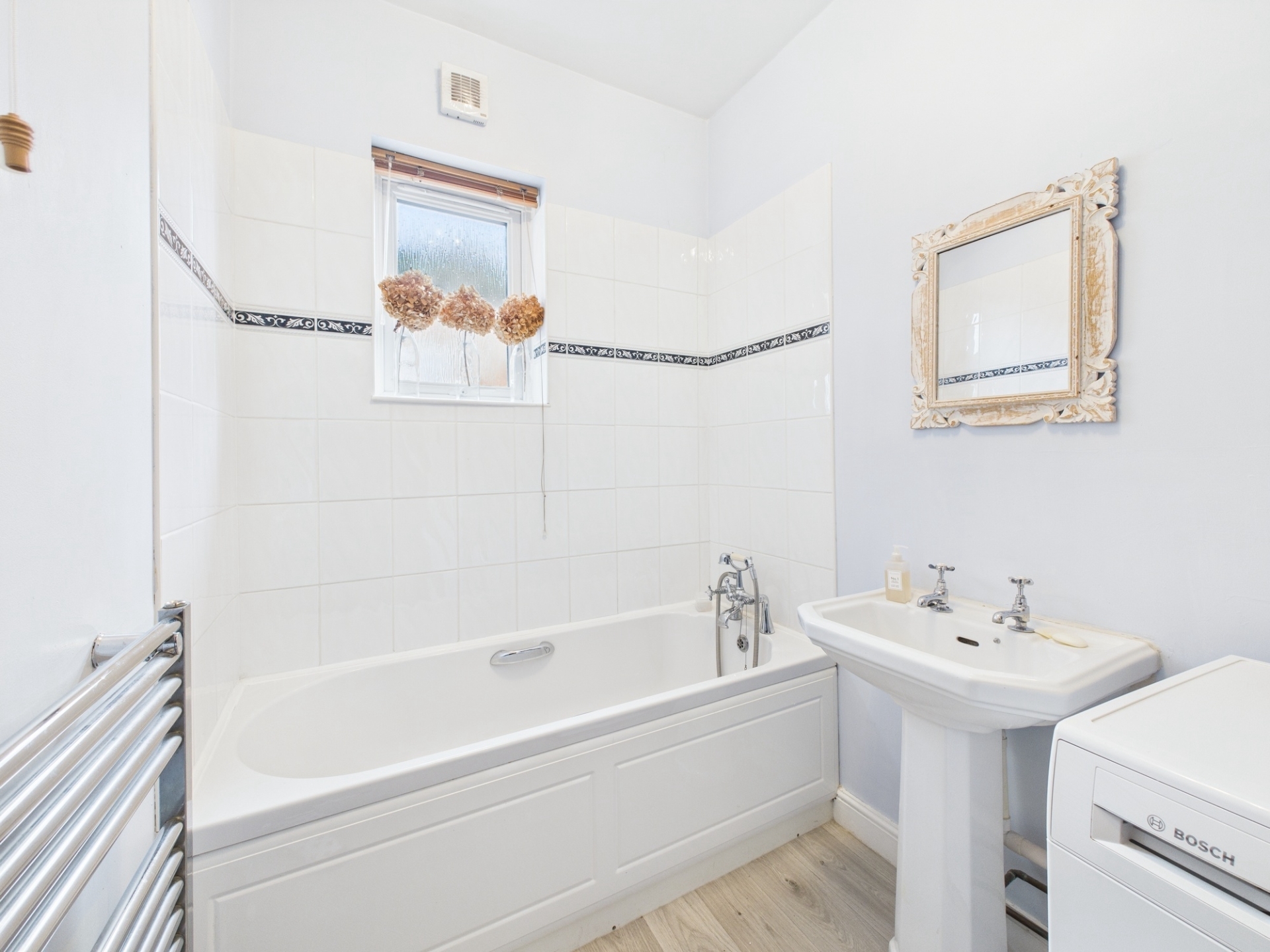 uPVC frosted sash window to side elevation. Radiator. Two piece suite comprising panelled bath and porcelain wash hand basin. Heated towel rail.