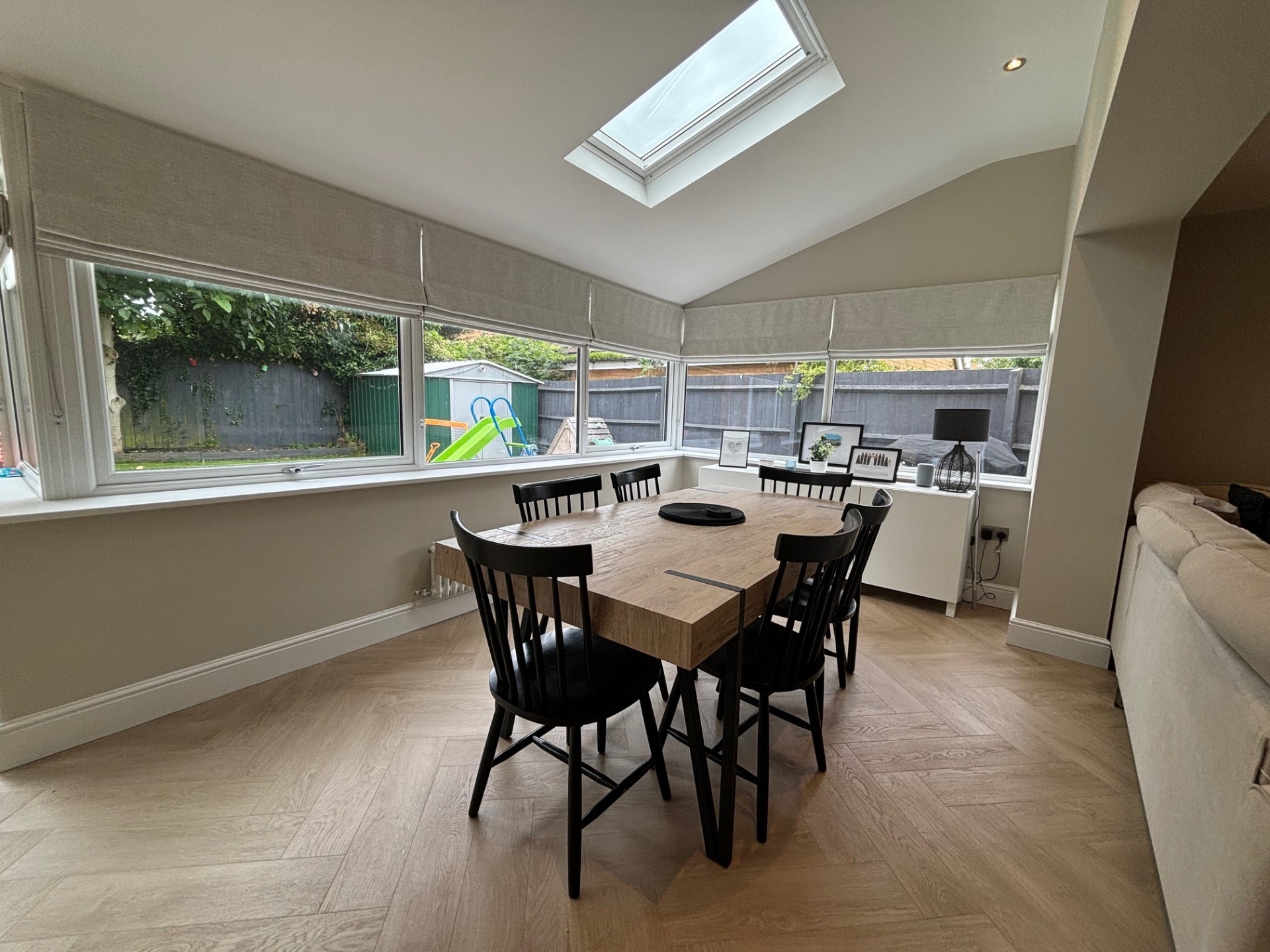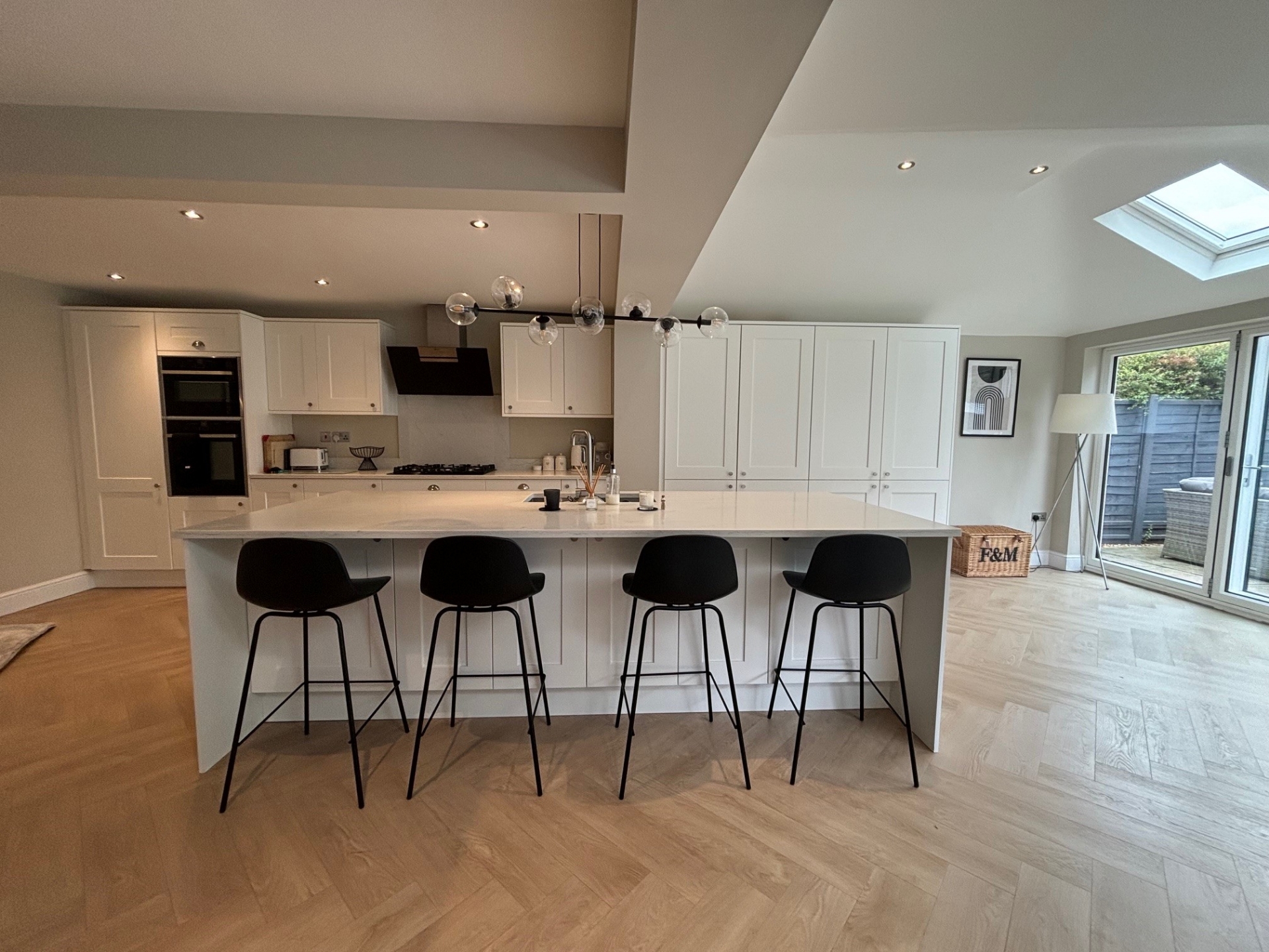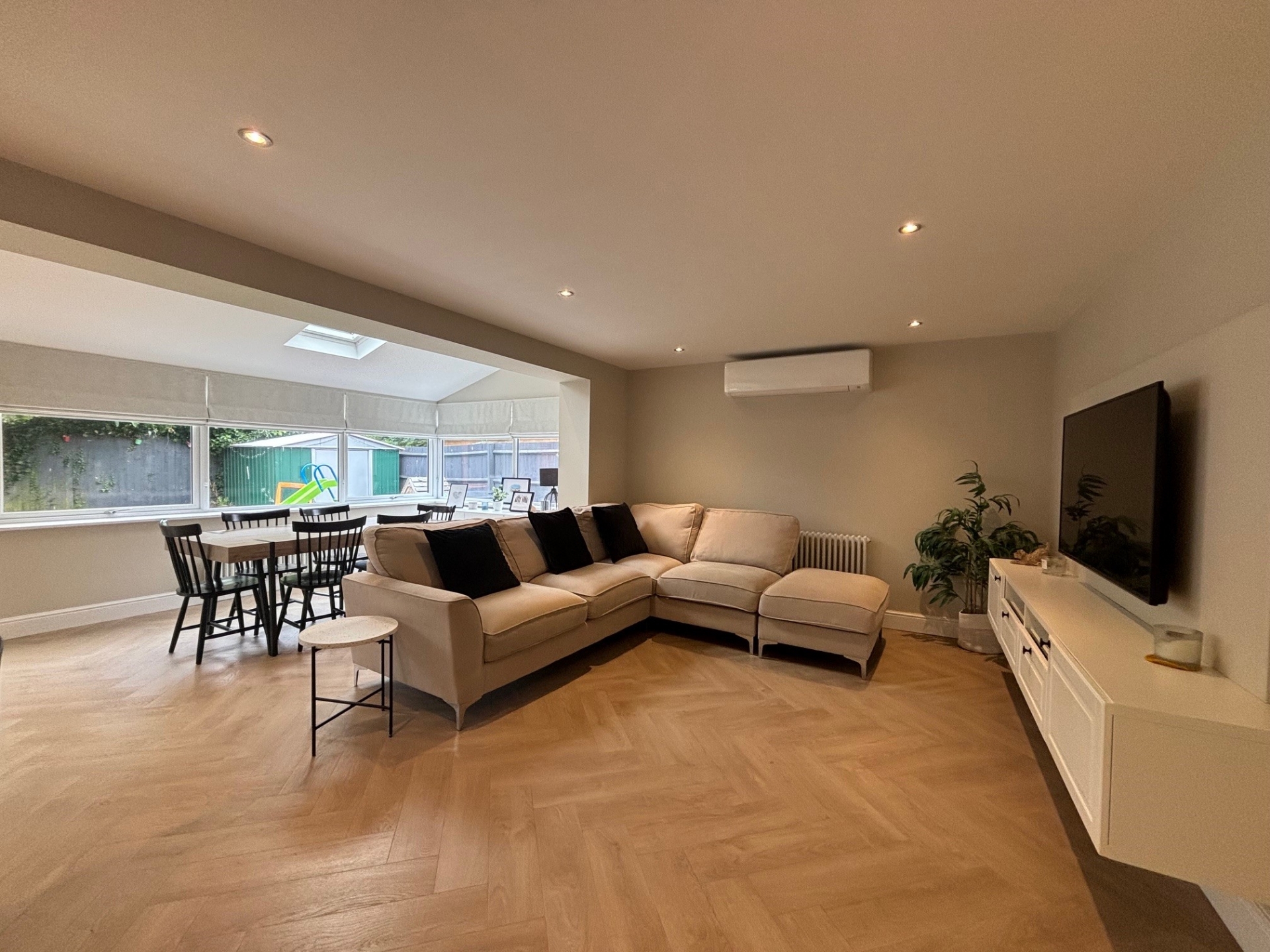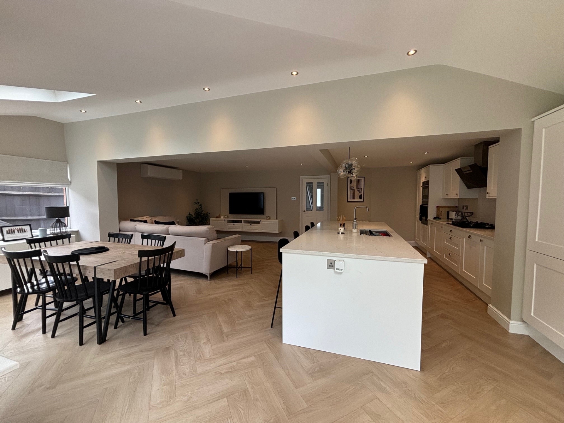 The greatly improved accommodation offers an open fronted porch with composite door into an entrance hall, cloakroom/WC, study, playroom, utility with door to side, fabulous extended family living space with room for sofas and dining table and having re-fitted kitchen units with built in ‘NEFF’ appliances and bi-fold doors to garden.