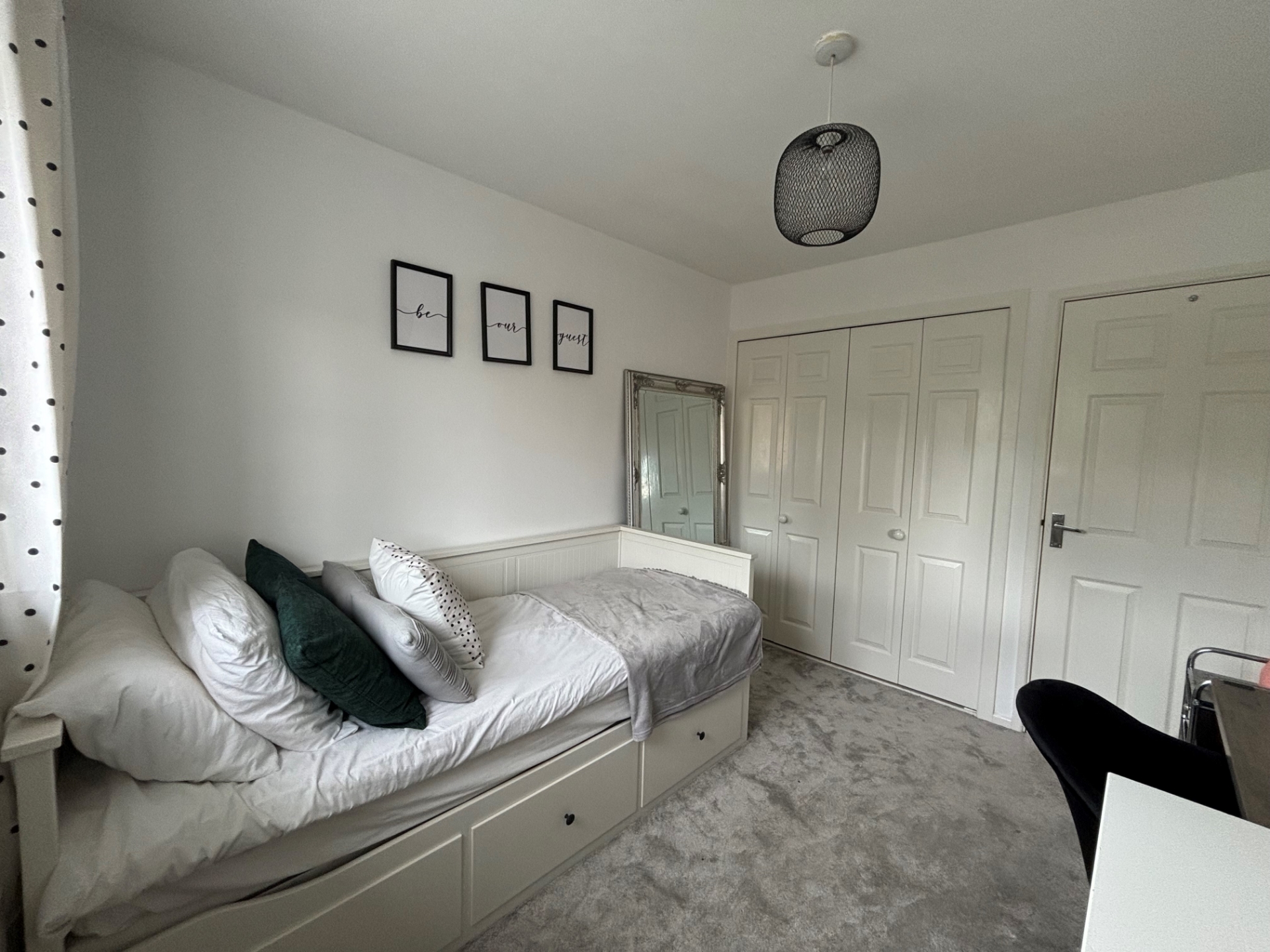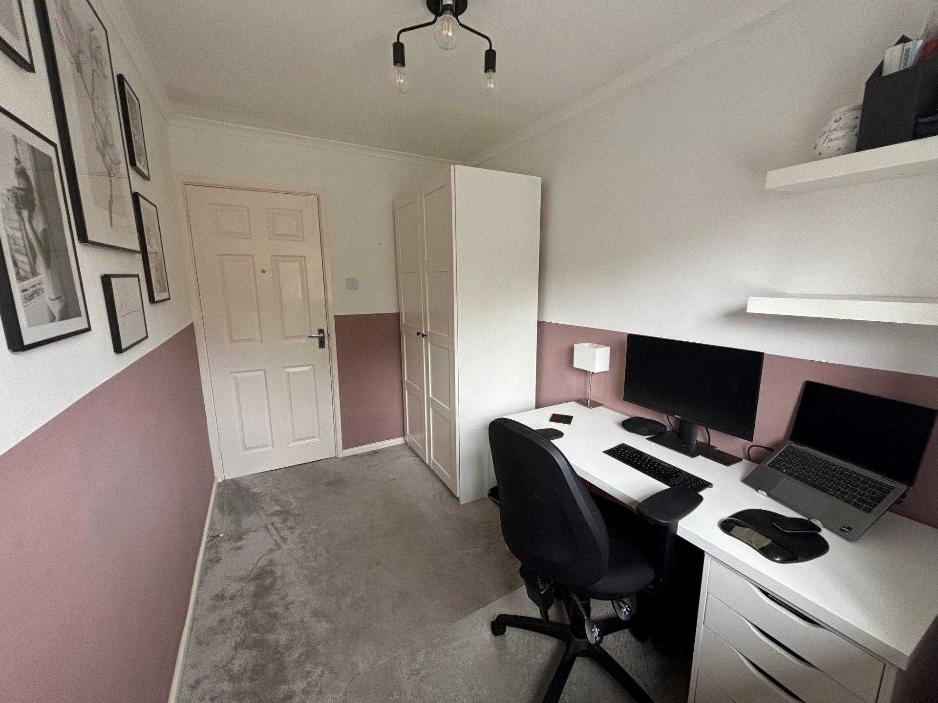 Outside the frontage is open plan with double width driveway and a side gate to an enclosed rear garden with metal storage shed.