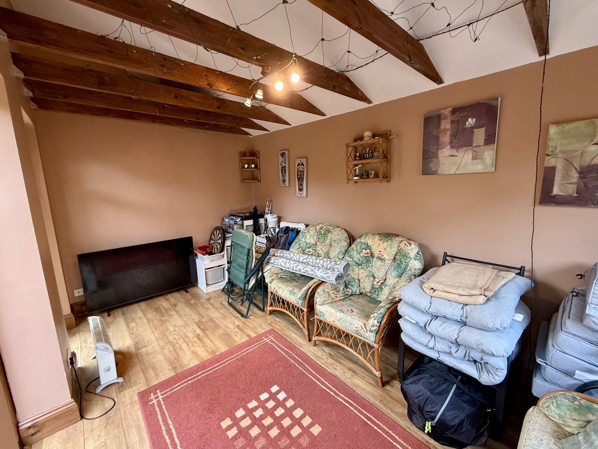 Radiator. Stone fireplace with electric fire in front. Television point. Opening to: