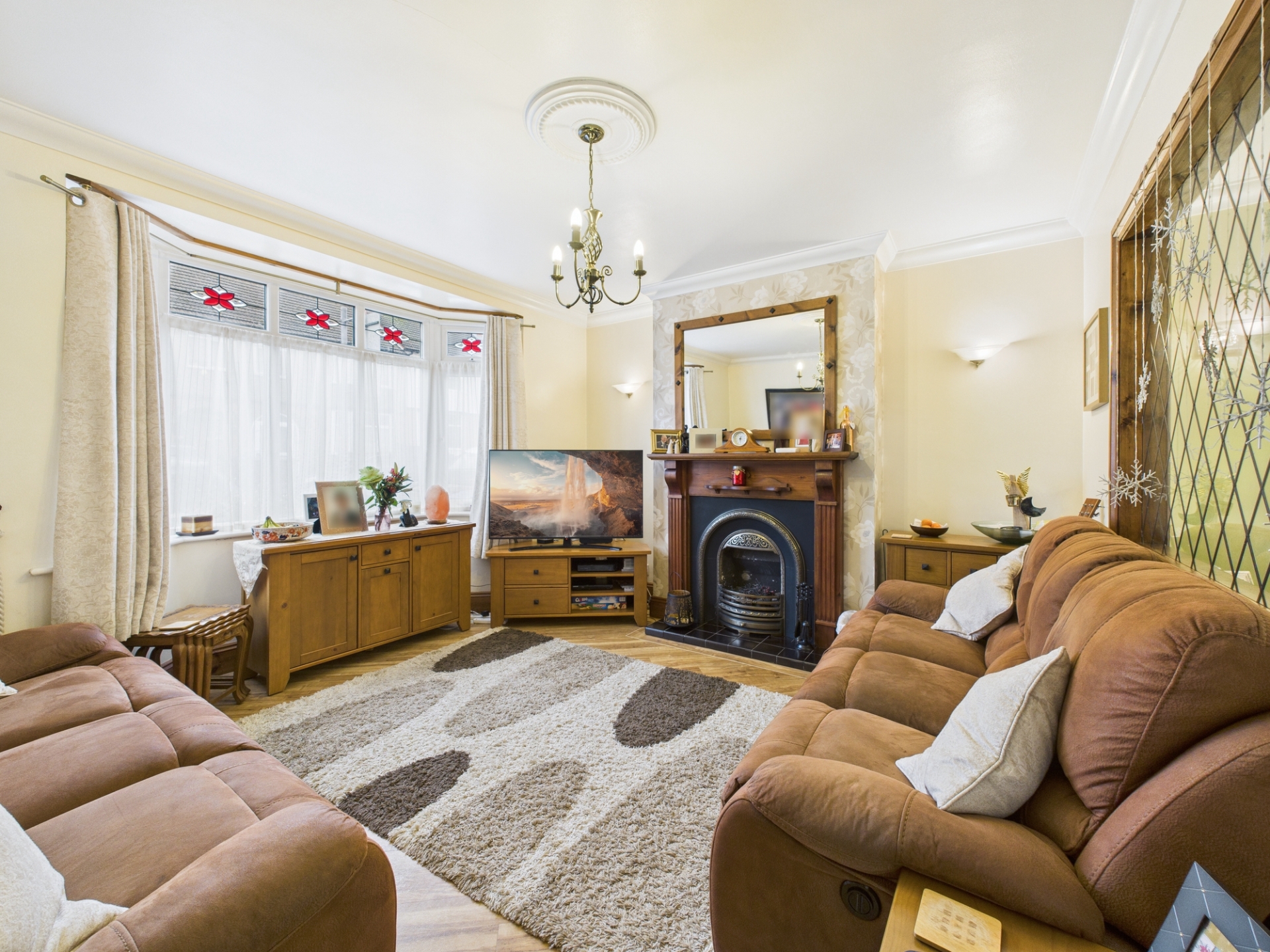 uPVC double glazed window to front elevation. Radiator. Feature ceiling rose. Fireplace with gas fire. Television point. Glazed window looking through dining room.
