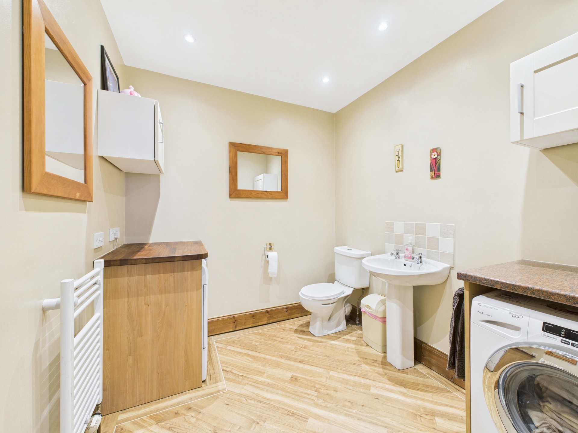 Spotlights to ceiling. Heated towel rail. Space for washing machine and tumble dryer. Low level WC. Porcelain hand wash basin.