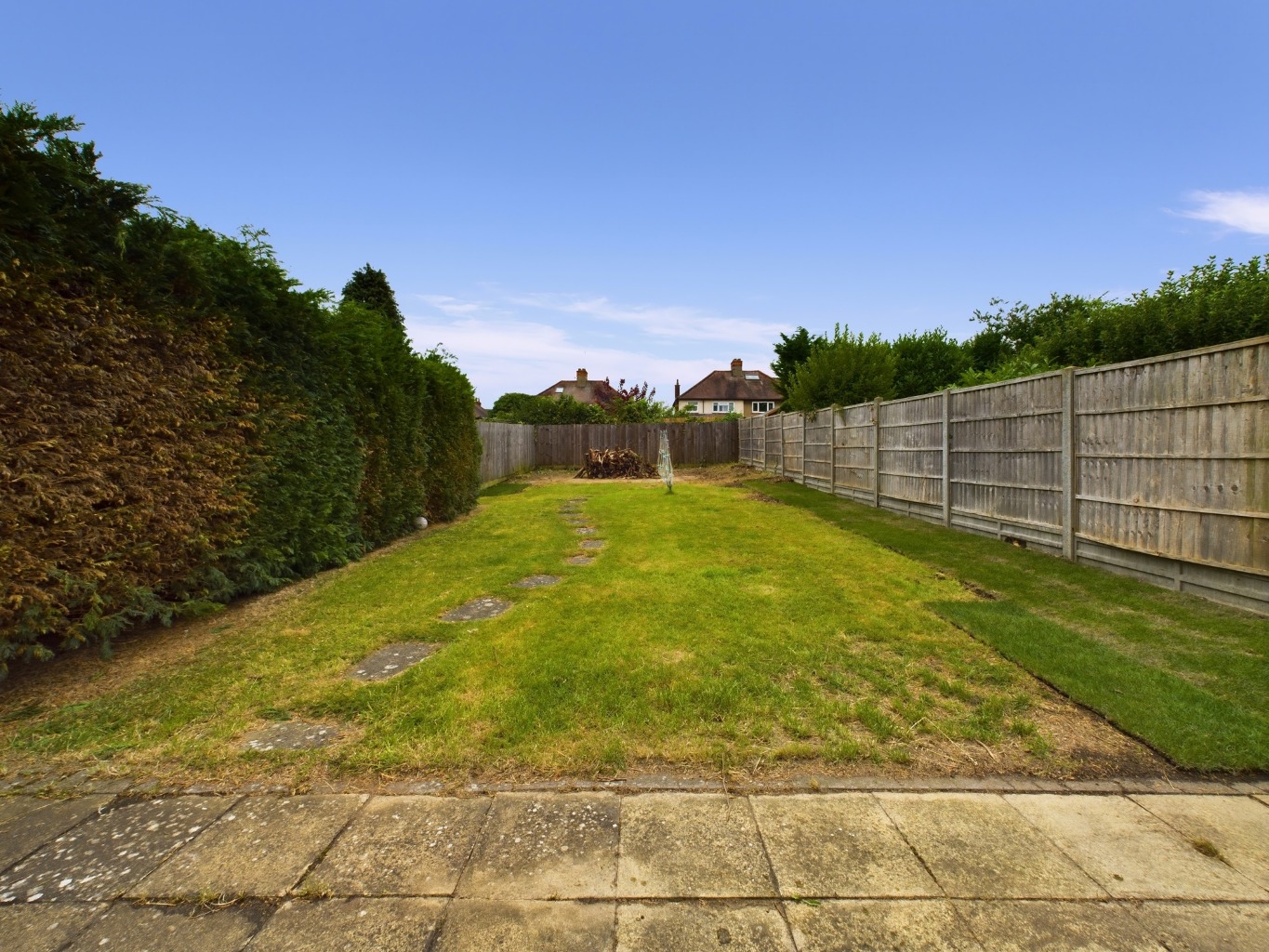 Enclosed by timber fencing to sides and rear. West Facing garden. Mainly laid to lawn. Two large patio areas. Hedging to left hand side. Outside tap. Light.