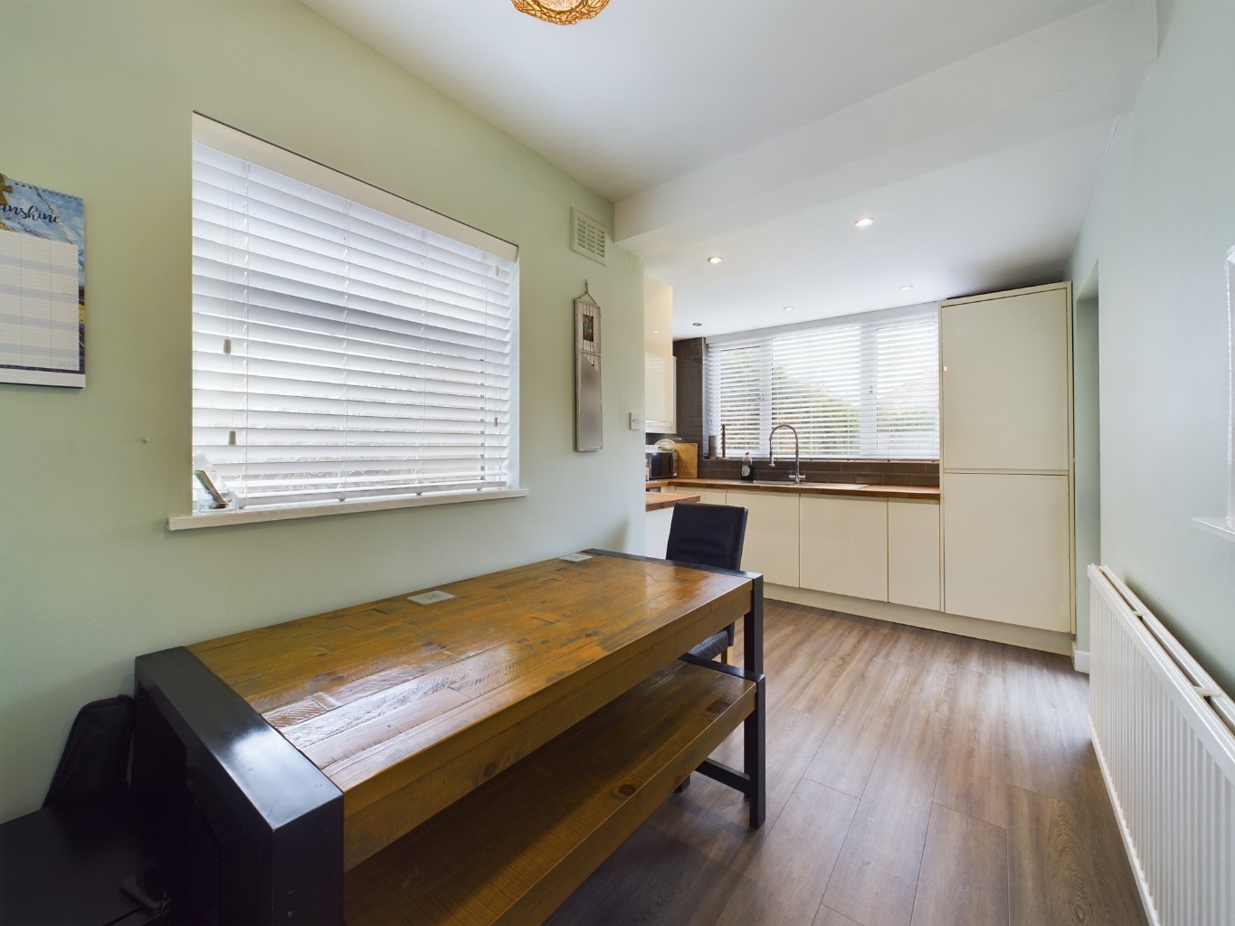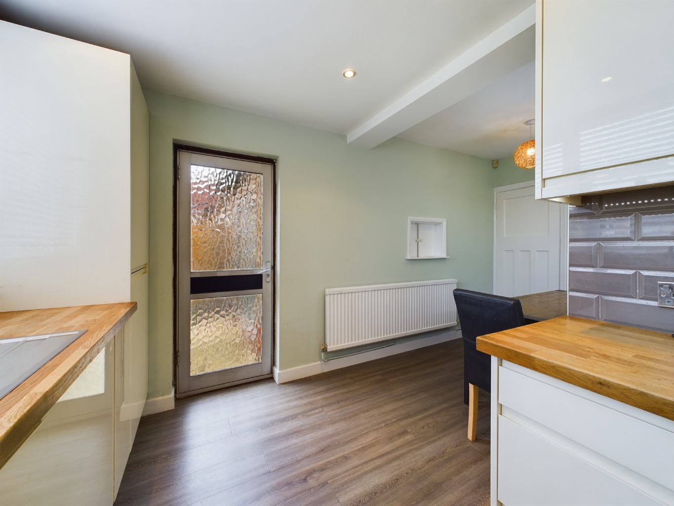 uPVC double glazed windows to side and rear elevations. Glazed door to side elevation. Spotlights. Radiator. A range of gloss wall and base units with solid oak work surfaces. One and a half bowl stainless steel sink and drainer. Integrated appliances to include AEG oven, four ring gas hob and extractor. Integrated dishwasher. Integrated fridge/freezer.