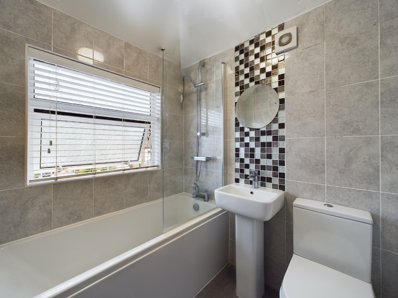 uPVC obscure double glazed window to front elevation. Heated towel rail. Three piece suite comprising panelled bath with shower over, low level WC and wash hand basin. Tiled floor. Tiling to splash back areas. Extractor.