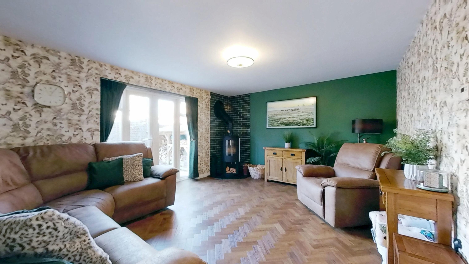 uPVC double glazed French doors to rear garden. Radiator. Wood burner. Central lighting. Door to kitchen/dining room.