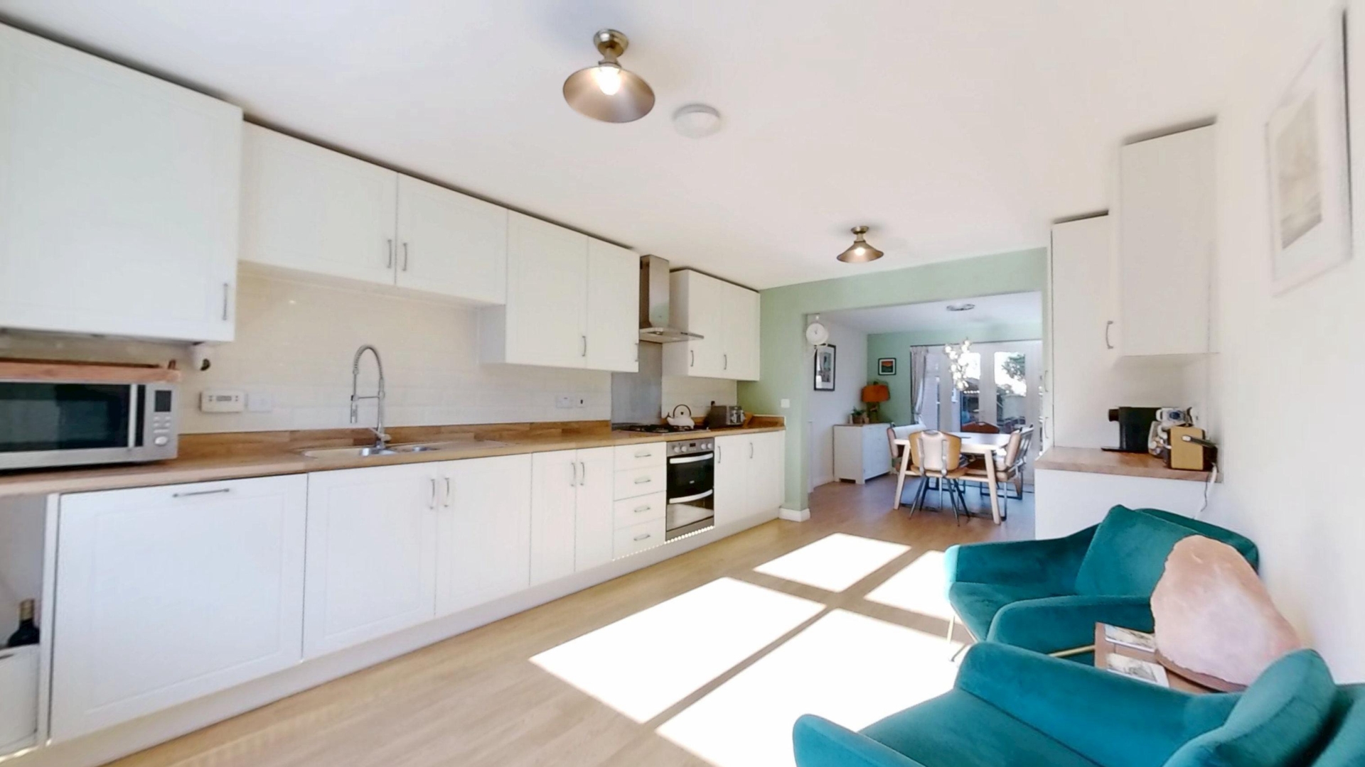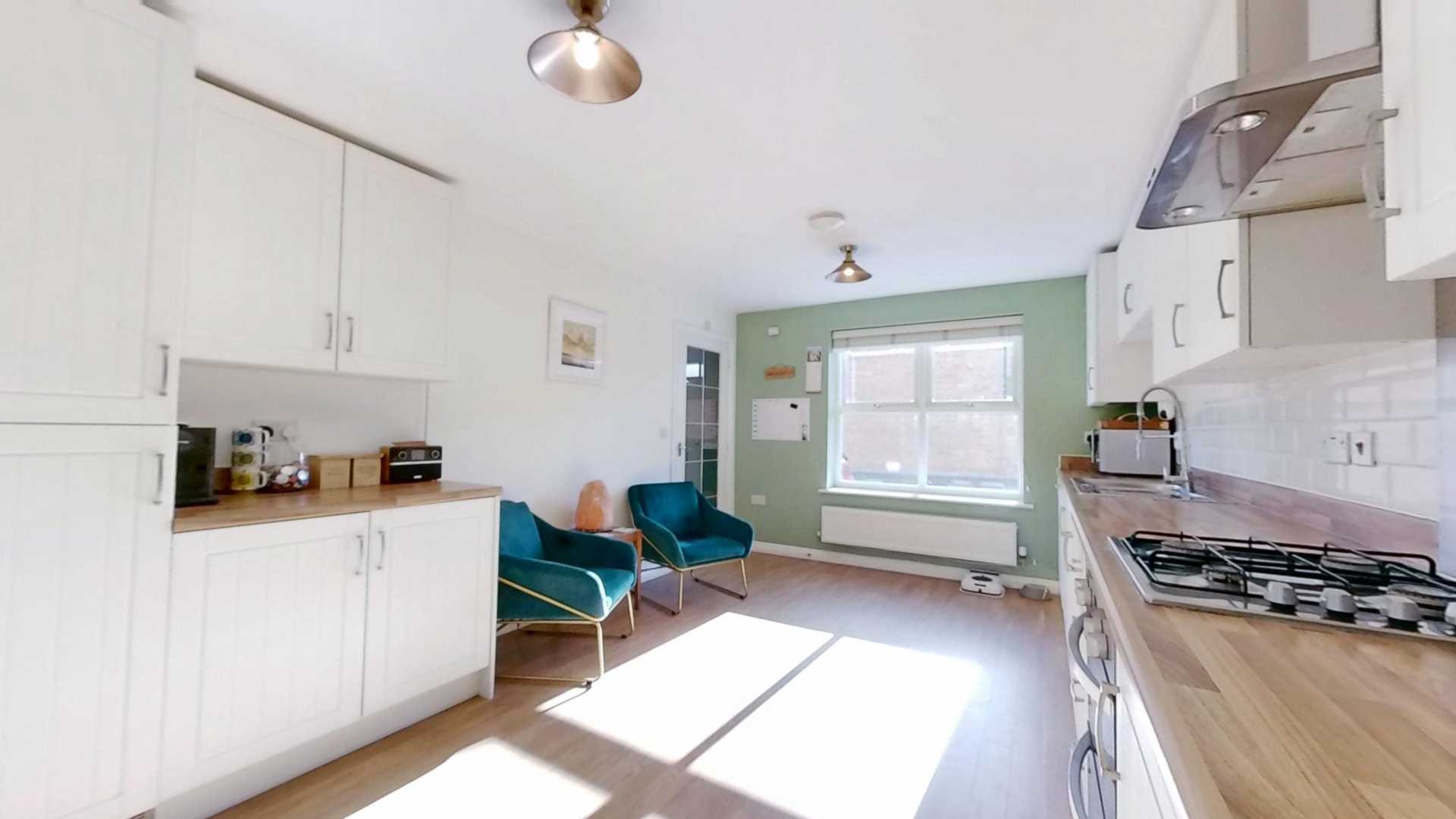 uPVC double glazed window to front elevation. uPVC double glazed French doors to rear elevation. Two radiators. A range of wall and base units. Sink with mixer tap. Integrated fridge/freezer. Four burner gas hob and double oven. Central lighting.