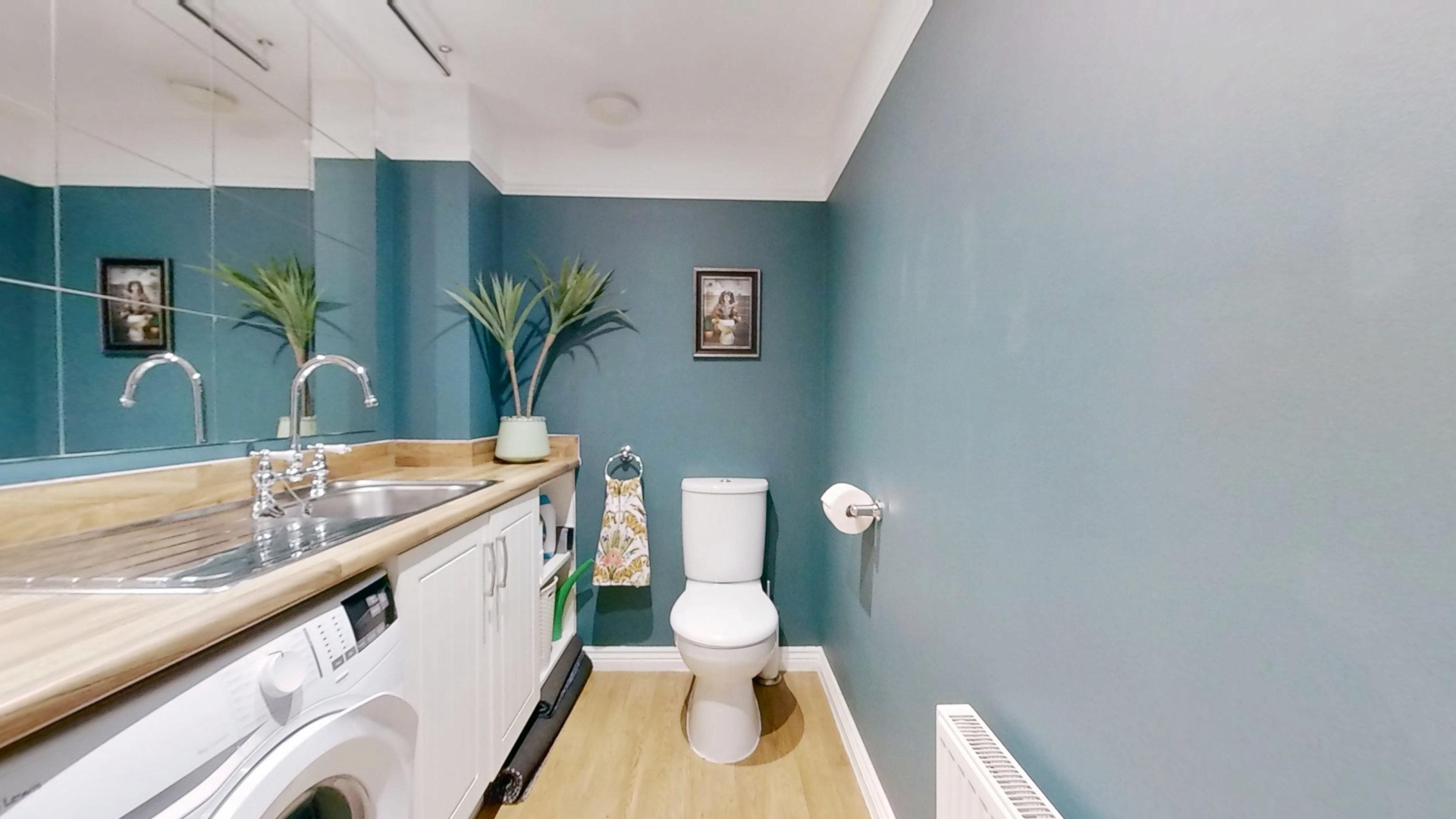 Radiator. Low level WC. Plumbing for washing machine. Base units. Spotlights.
