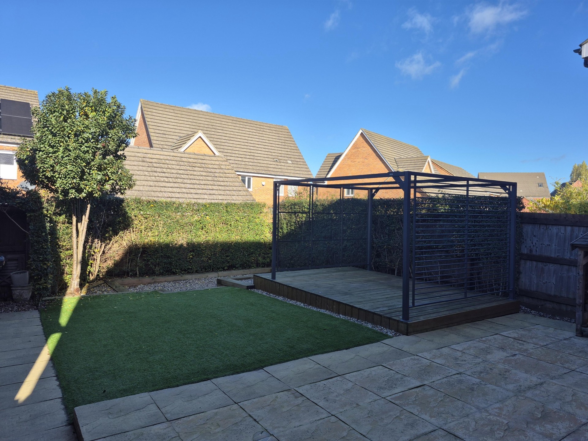 Patio area. Artificial lawn. Decking. Side access gate. Door to garage. Outside tap. Power socket.