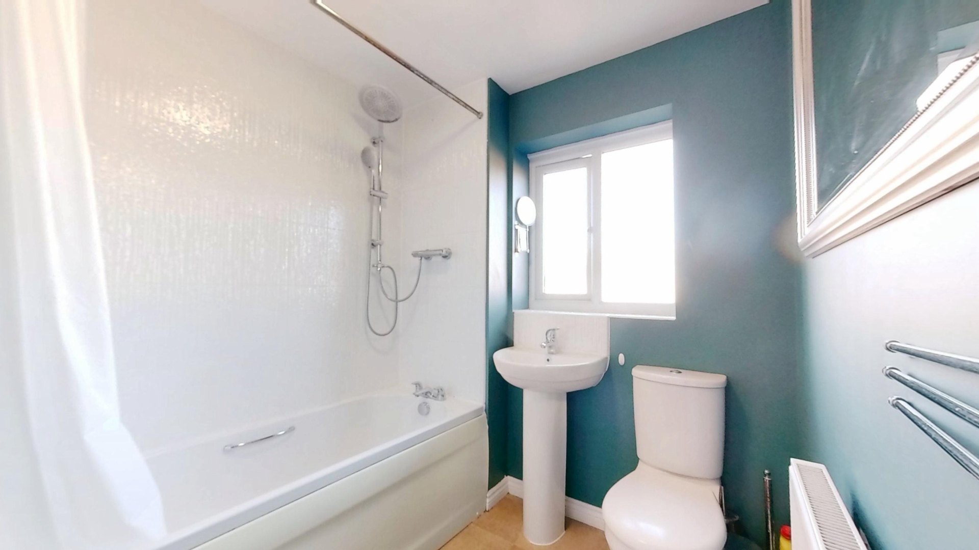 Obscure double glazed window to rear elevation. Radiator. Suite comprising bath with shower over, low level WC and wash hand basin.