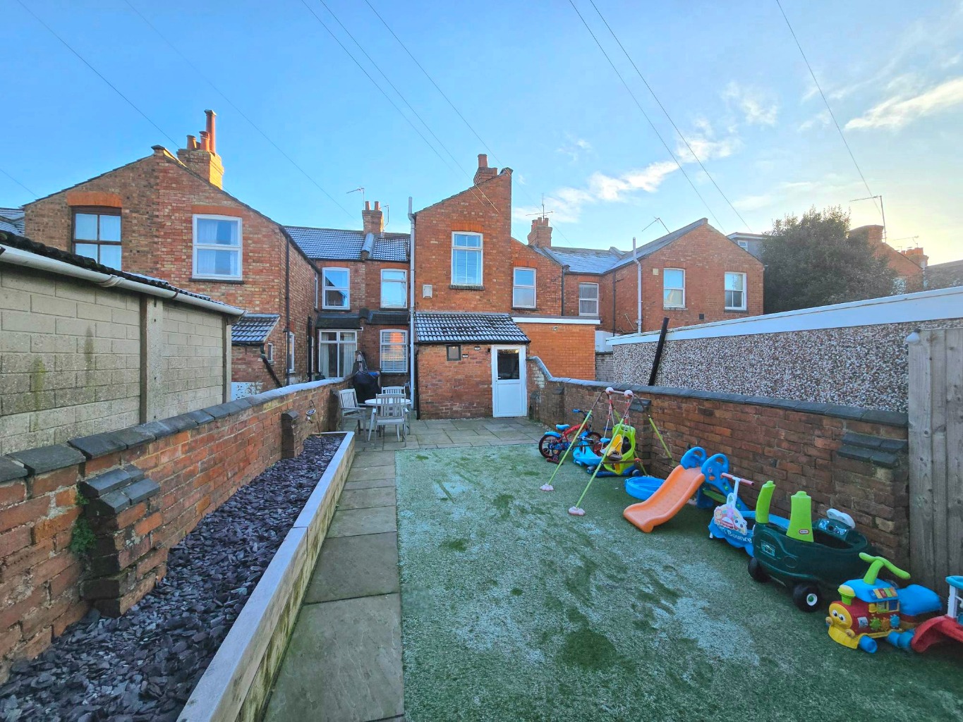 A landscaped rear garden with artificial lawn, block paved patio and raised beds. Pathway to rear access.