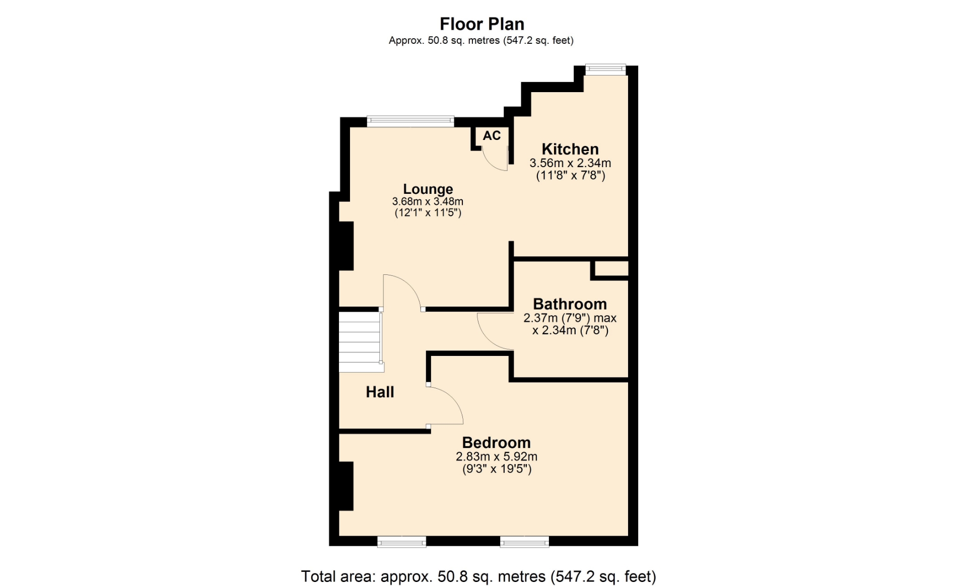 The apartment is accessed via a communal entrance door and staircase leading to the main accommodation. Upon entry, the entrance hall provides stairs rising to the upper floor and useful understairs storage with hanging space for coats.
