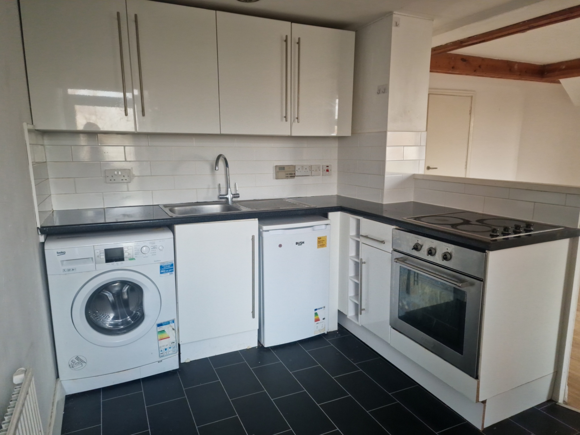 The kitchen area is fitted with wall and base units with work surfaces over, a breakfast bar, tiled splashbacks, a one bowl sink with stainless steel mixer tap, built in oven and hob, and space for a washing machine and fridge. Additional features include tiled flooring, a radiator and spotlights.