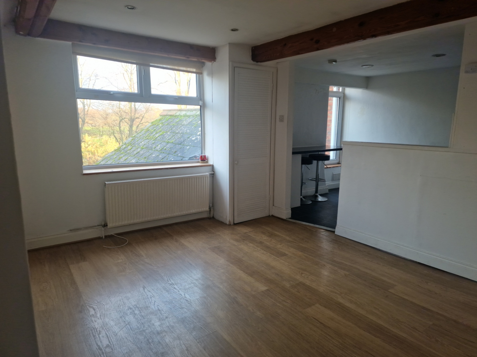 The open plan living room and kitchen enjoys a double glazed uPVC window with views over the Racecourse, exposed beams, panelled flooring and spotlighting. There is also an airing cupboard housing the gas boiler.