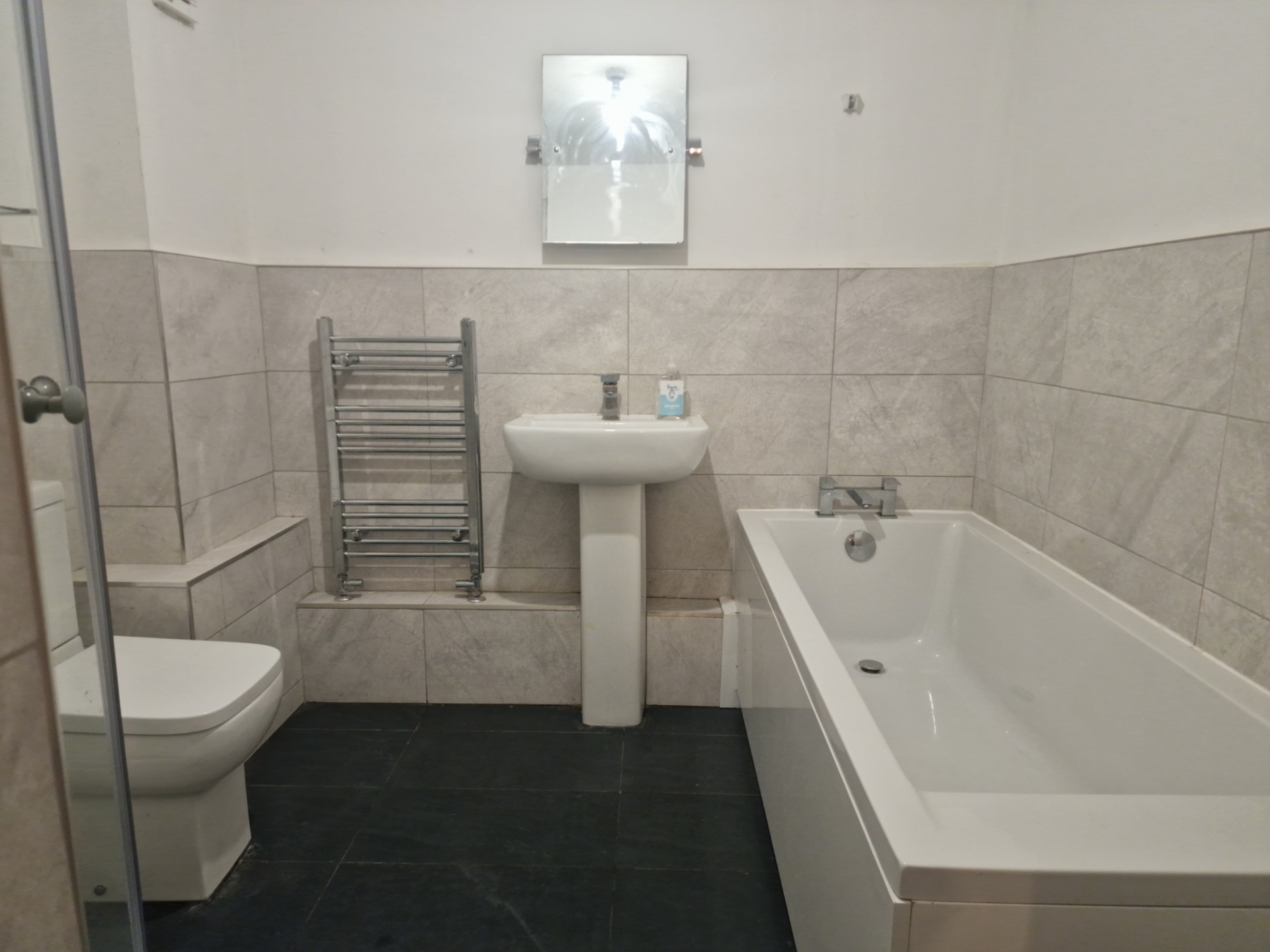 The bathroom is fitted with a four piece suite comprising bath, separate shower, low level WC and pedestal wash hand basin, complemented by part tiled walls, tiled flooring and a radiator.