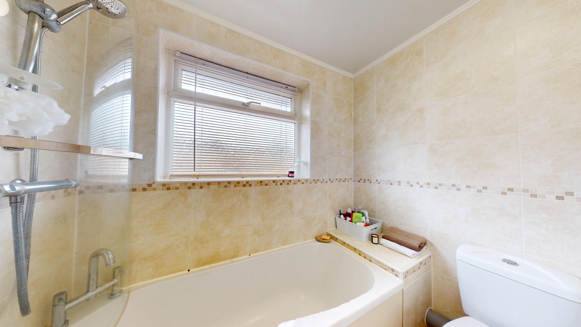 Obscure double glazed window to front elevation. Heated towel rail. A white suite comprising panelled bath with shower over, pedestal wash hand basin and low level WC. Tiled walls.